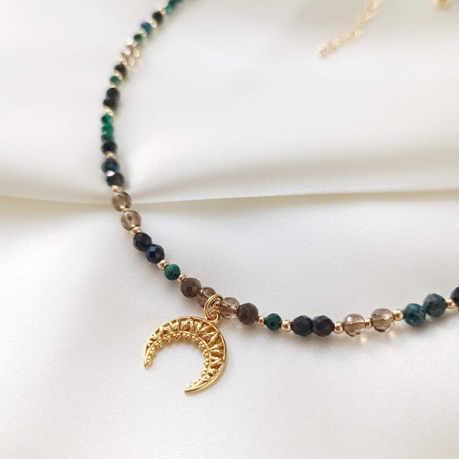 Każdy egzemplarz tego chokera jest starannie wykonany ręcznie, co podkreśla jego unikalność. Połączenie szlachetnych kamieni, ochronnej lunuli i starannie dobranych detali tworzy biżuterię, która nie tylko zachwyca swoim wyglądem, ale także emanuje spokojem, harmonią i siłą.