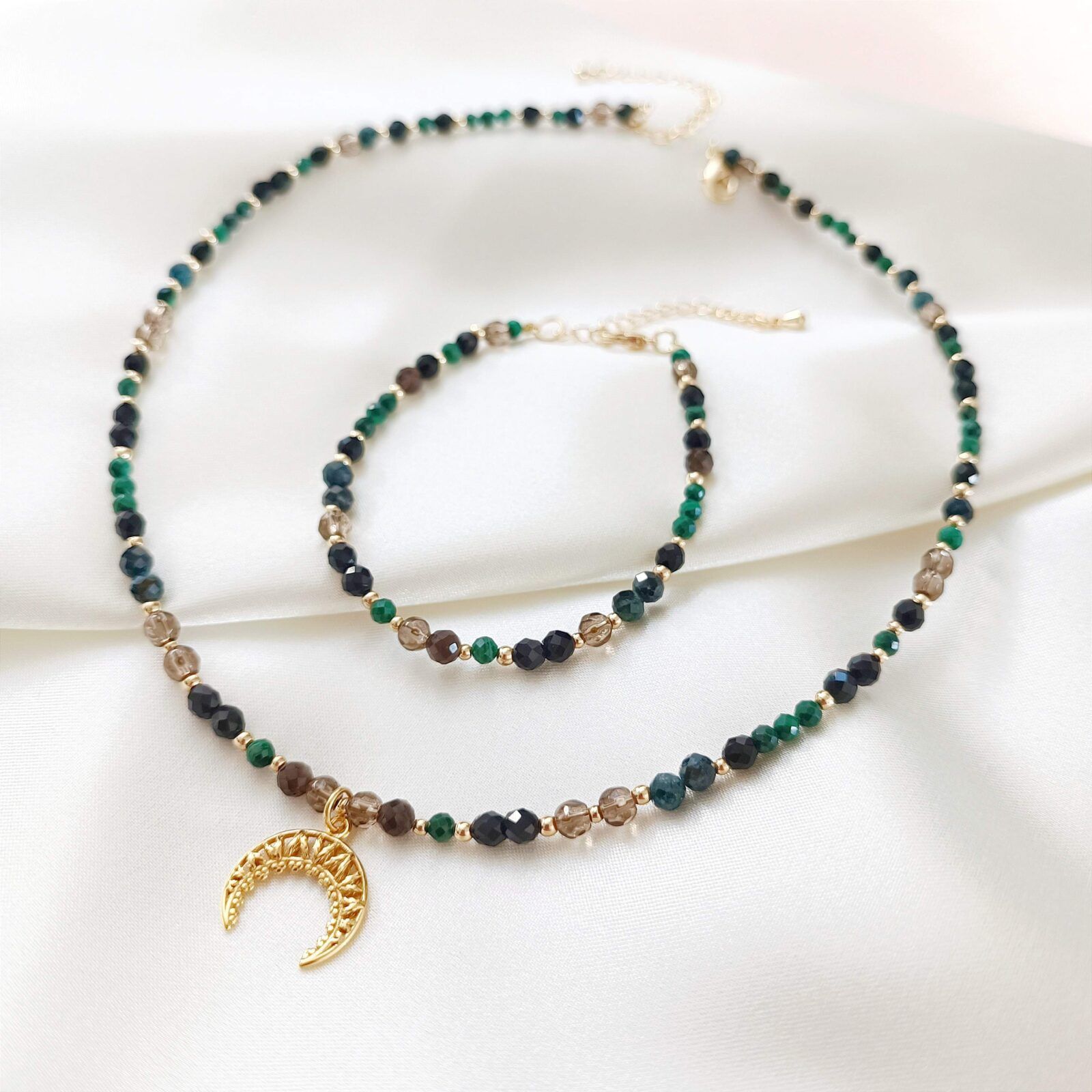 Choker w zielono-czarnej kolorystyce to biżuteria o wyjątkowej symbolice. Połączenie malachitu, czarnego i niebieskiego turmalinu, kwarcu dymnego oraz obsydianu sprawia, że naszyjnik nie tylko zachwyca głębią barw, ale również pełni rolę silnego talizmanu ochronnego.