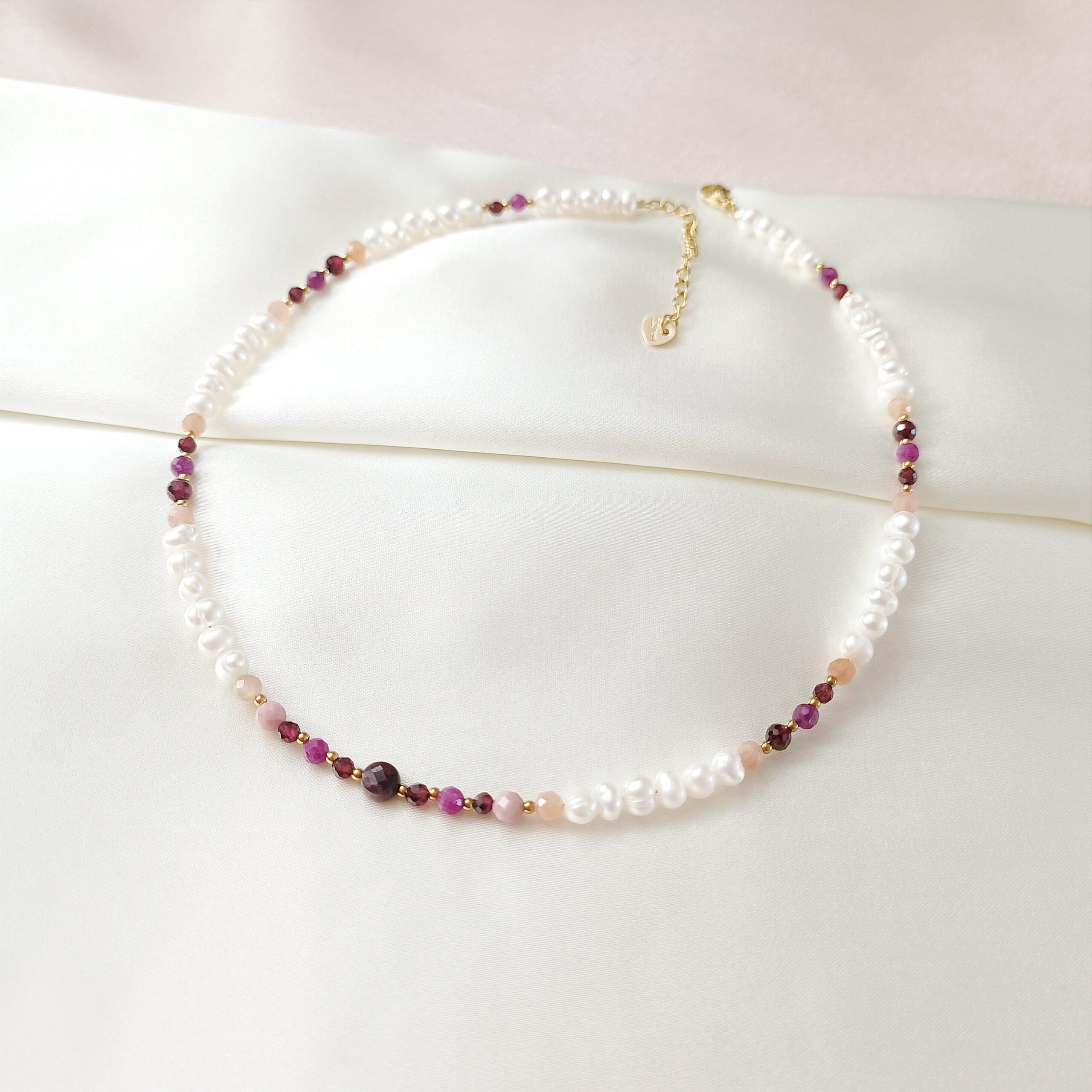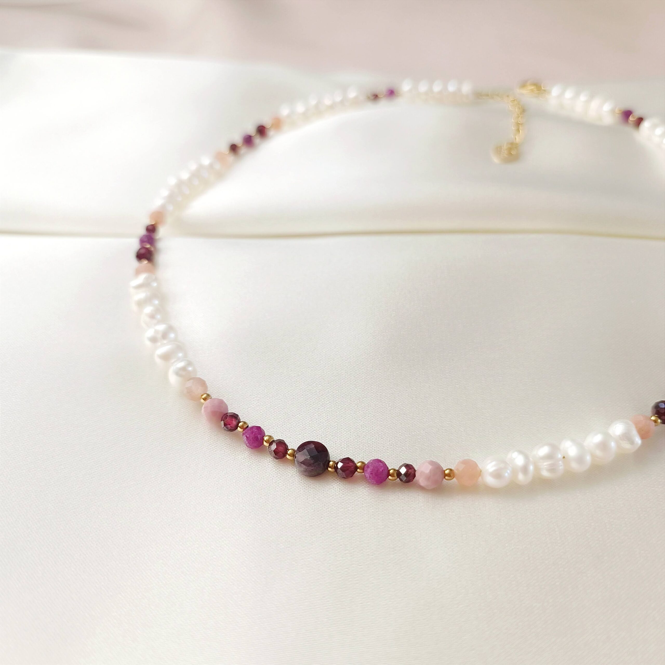 Wykonany z dbałością o każdy detal, ten naszyjnik to przykład biżuterii handmade, w której tradycyjne rzemiosło łączy się z nowoczesnym designem. Starannie dobrane kamienie w ciepłych, różowo-bordowych odcieniach tworzą harmonijną kompozycję. Oprócz pereł znajdują się w nim rubin, granat, kamień słoneczny i rodonit – każdy z nich ma swoją unikalną symbolikę:
