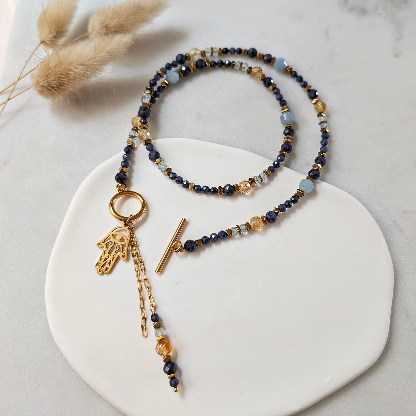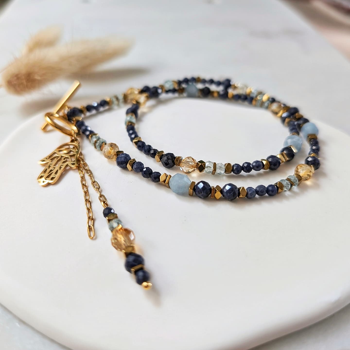 Naszyjnik wykonany z kamieni naturalnych: szafir, cytryn, akwamaryn, hematyt.