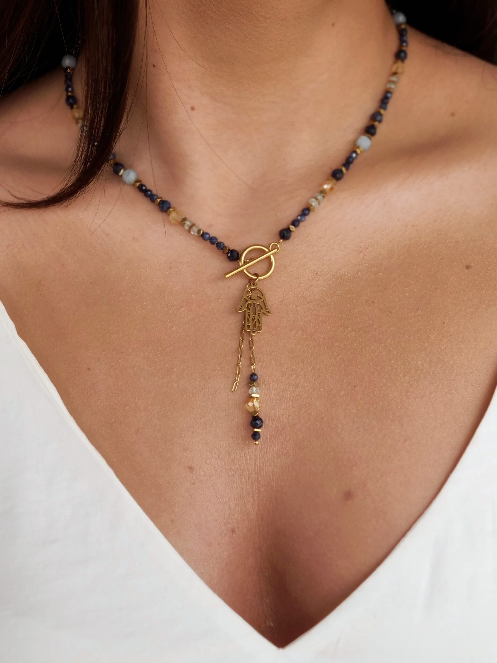 Zawieszki – ręka Fatimy oraz łańcuszki – pusty i wykończony kamieniami, które występują w naszyjniku.