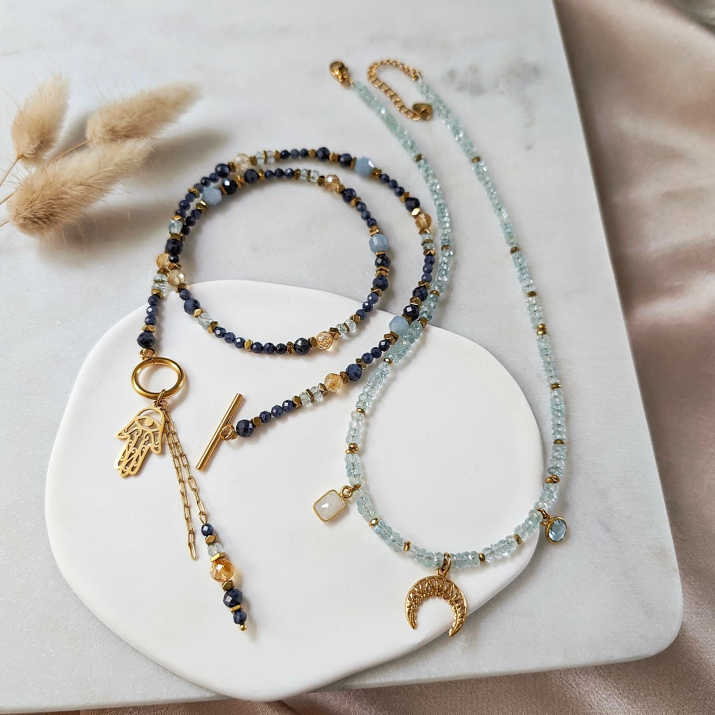 Akwamaryn występuje w naszyjniku w dwóch rodzajach – większych, błękitnych baryłek oraz mniejszych oponek najwyższej czystości. Akwamaryn to kamień spokoju, odwagi i komunikacji. Pomaga w wyrażaniu emocji, wspiera szczerość i jasność w relacjach. Działa uspokajająco, redukuje stres i napięcie. Jego energia kojarzona jest z czystością wody, sprzyja harmonii i wewnętrznej równowadze.