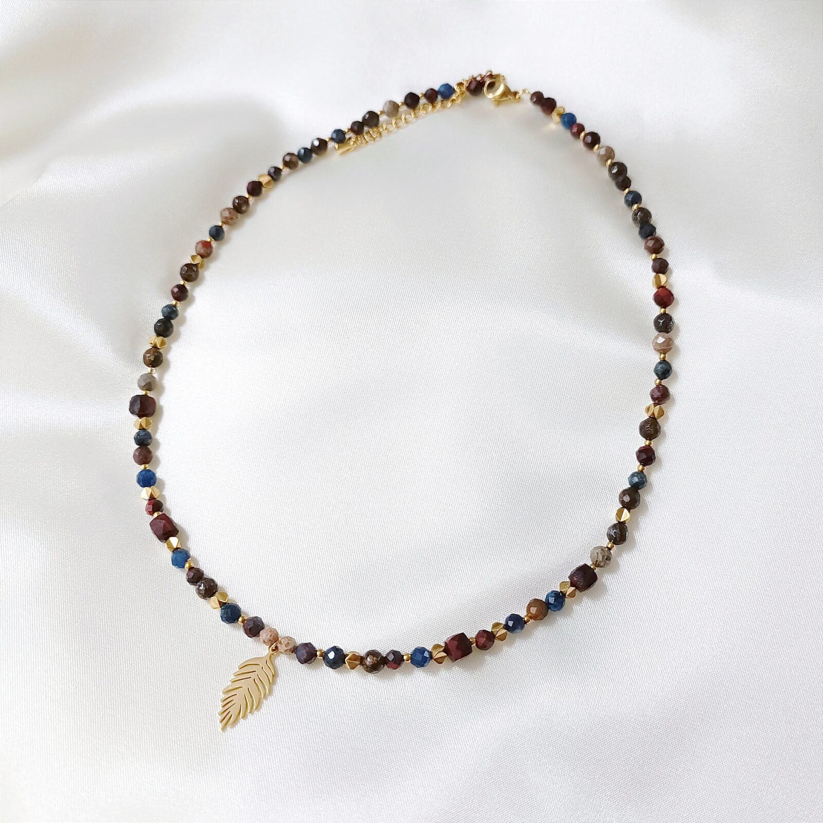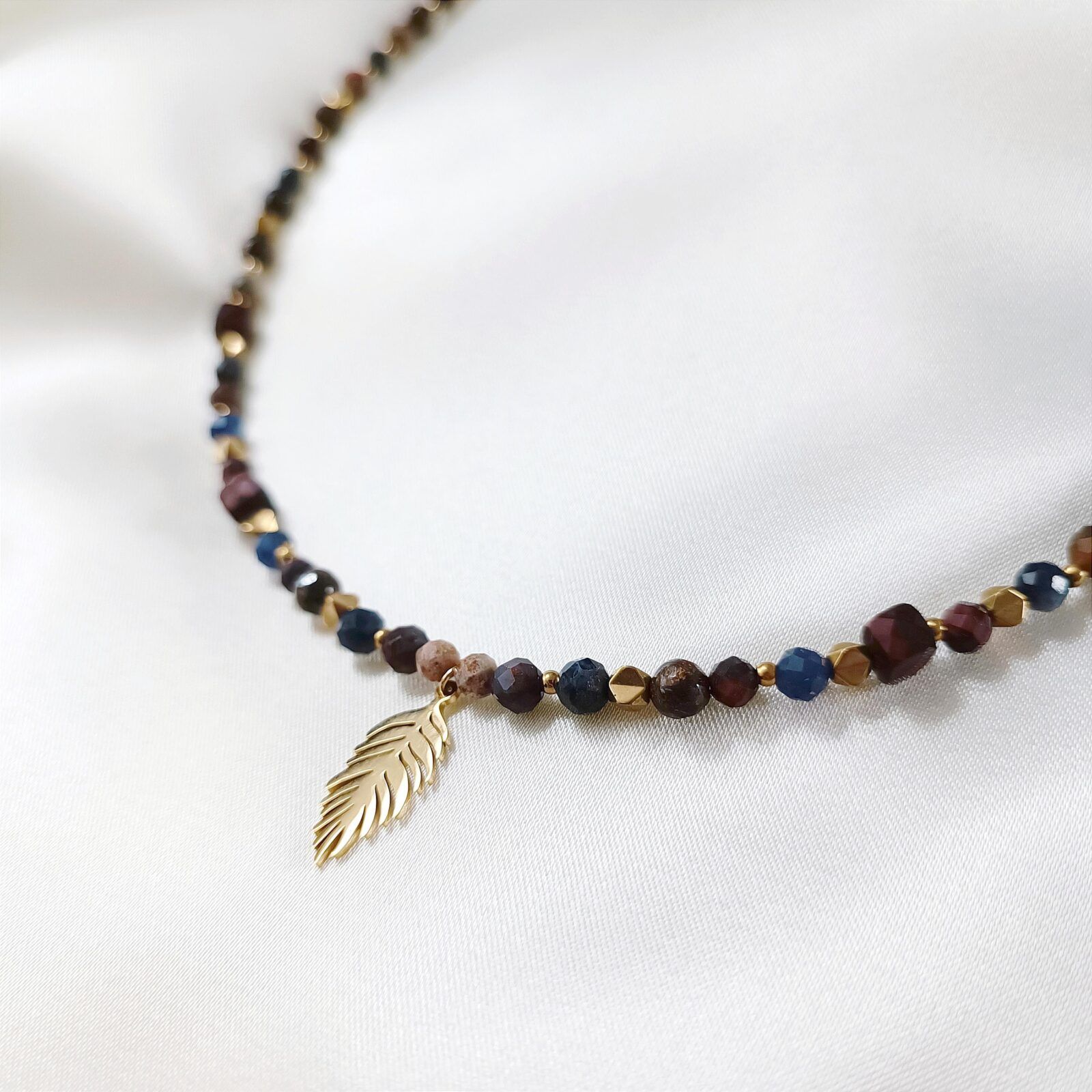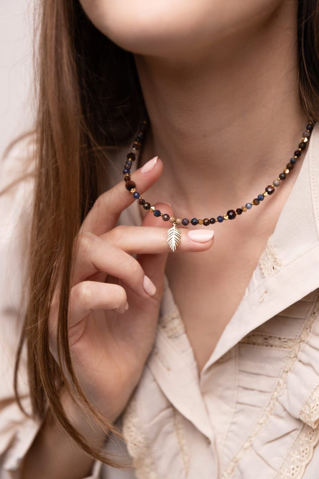 AYANI to naszyjnik w stylu boho, w odcieniach brązu, granatu i beżu. Dzięki uniwersalnej kolorystce oraz wyjątkowemu doborowi kamieni, zyskujesz nie tylko dodatek pasujący do wielu stylizacji, ale również osobisty talizman.