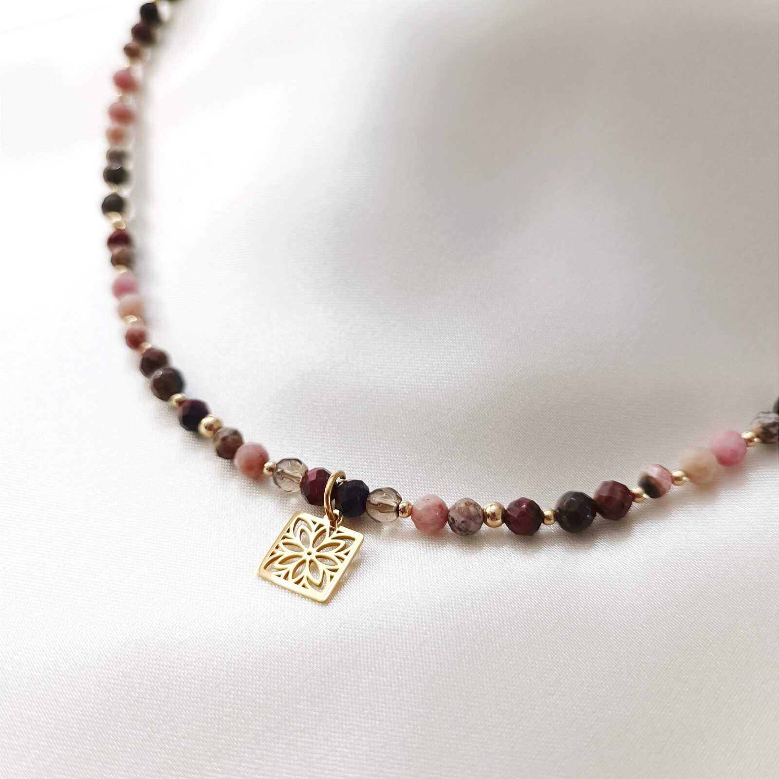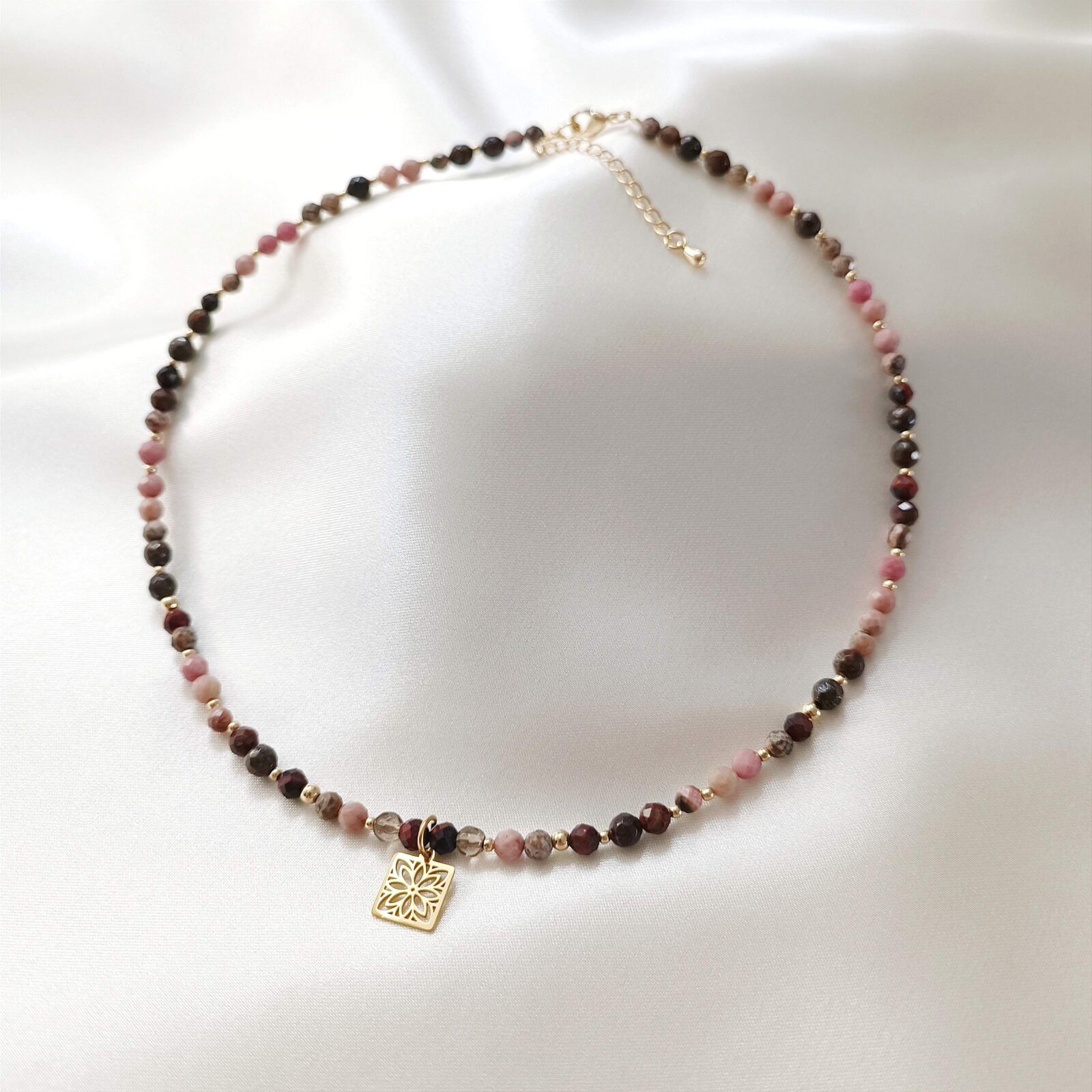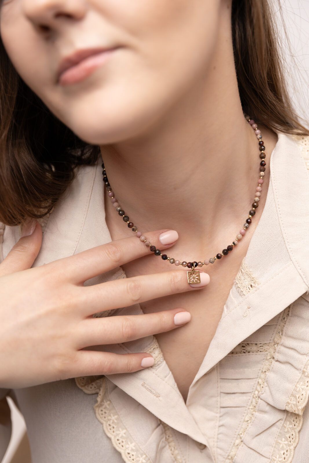 MORAH to naszyjnik w tonacji brązowo – różowej. Dzięki uniwersalnej kolorystce oraz wyjątkowemu doborowi kamieni, zyskujesz nie tylko dodatek pasujący do wielu stylizacji, ale również osobisty talizman.