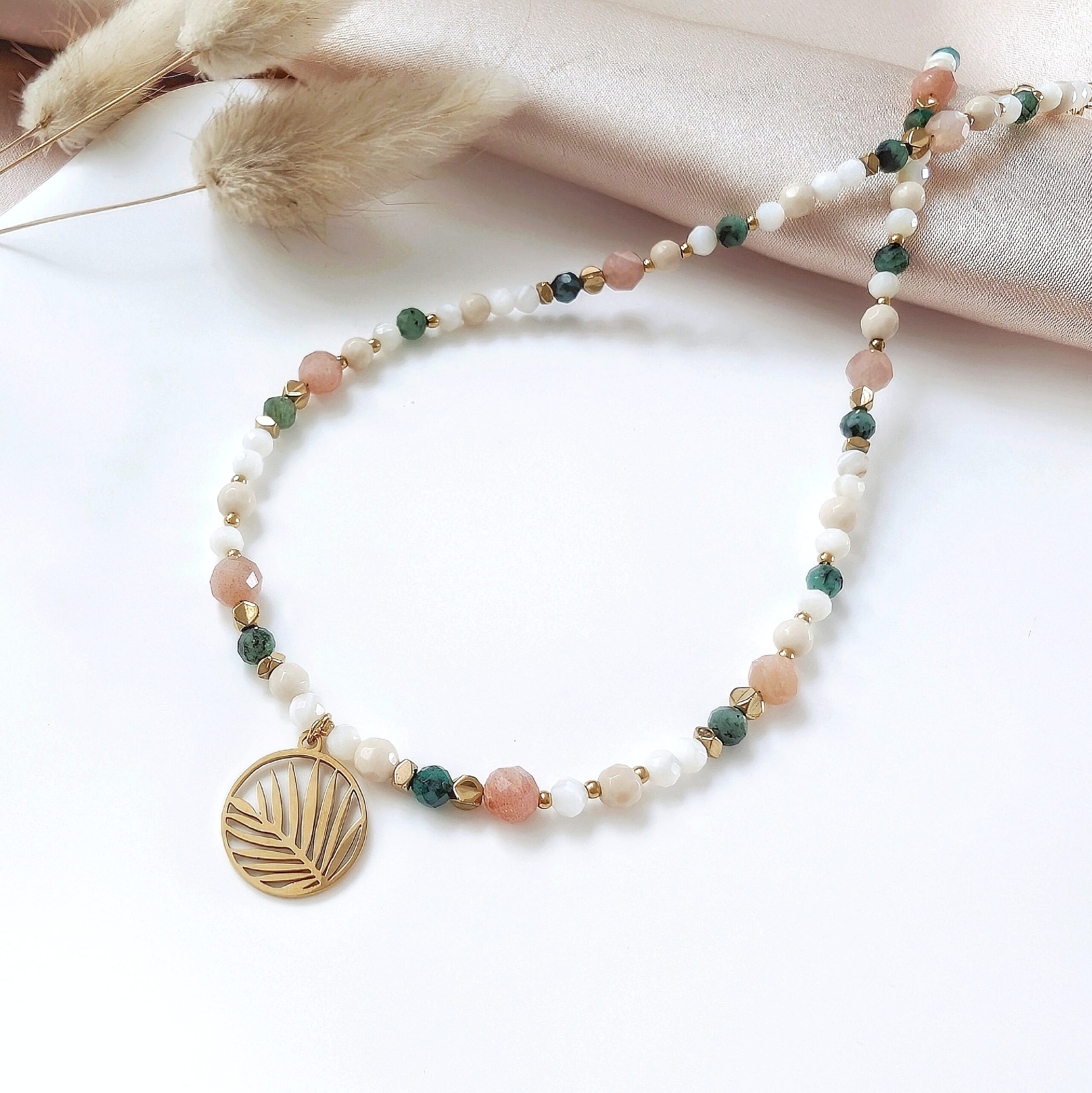 Naszyjnik – choker z kamieniami naturalnymi: szmaragd, kamień słoneczny, kamień rzeczny, hematyt oraz z naturalną białą muszlą.