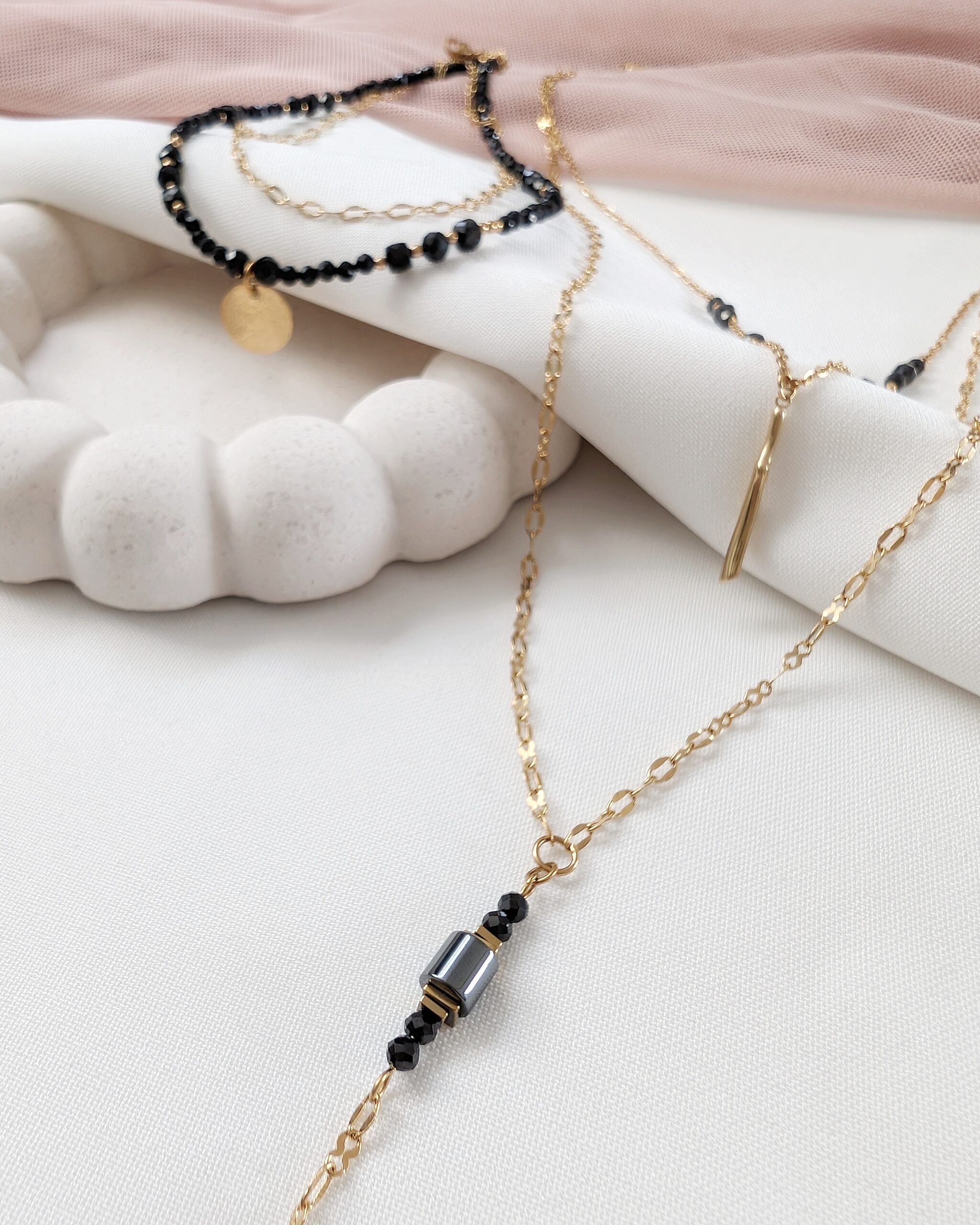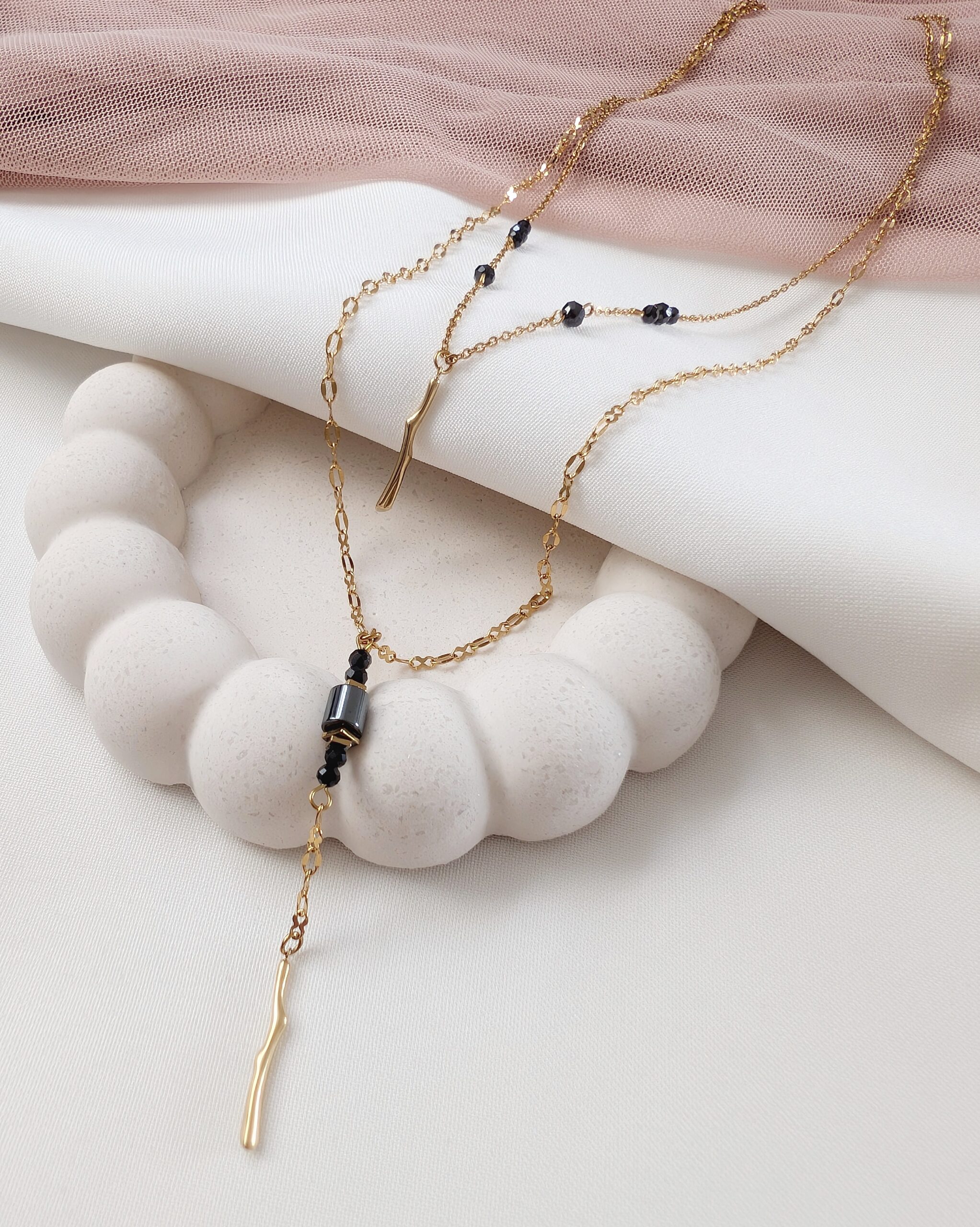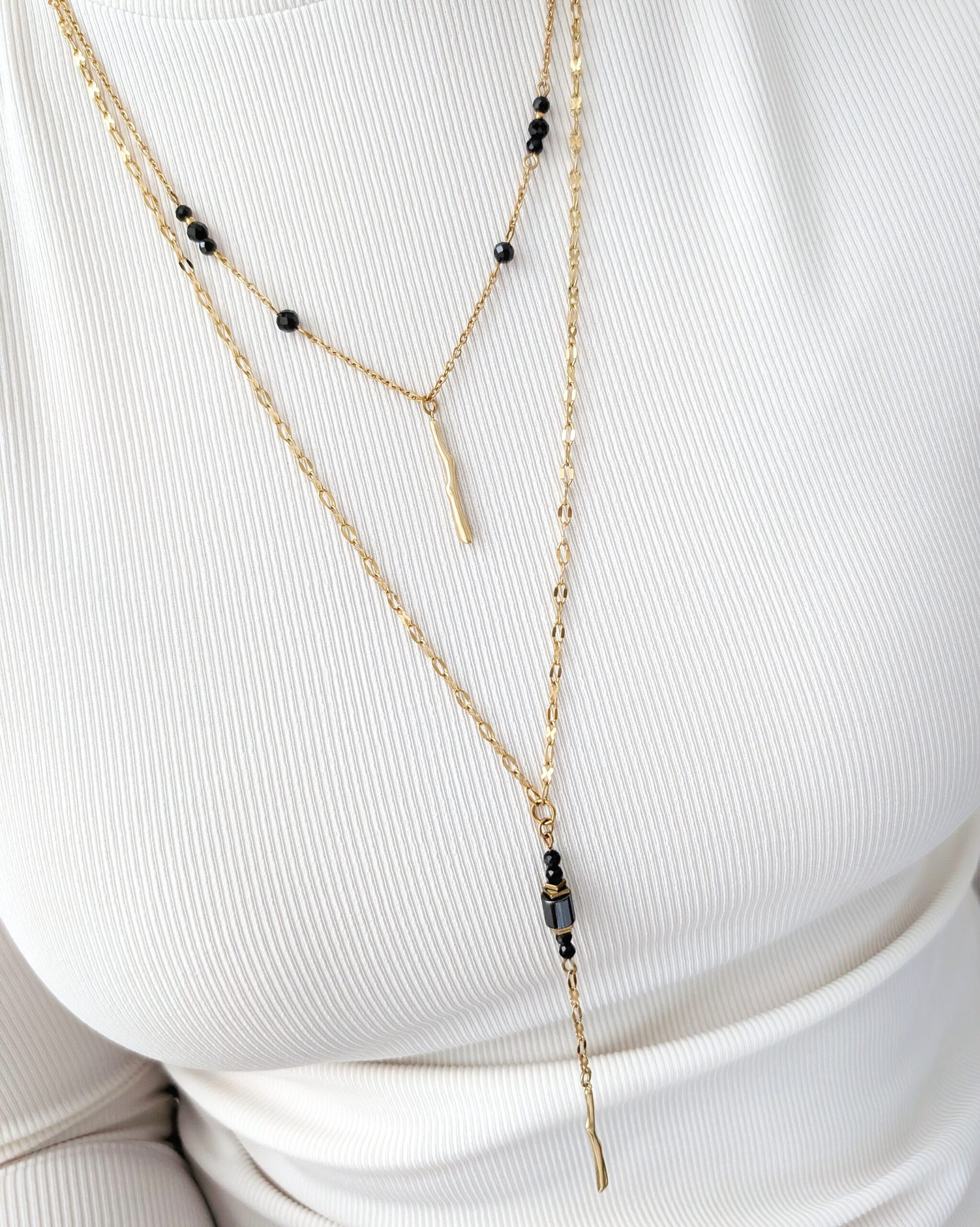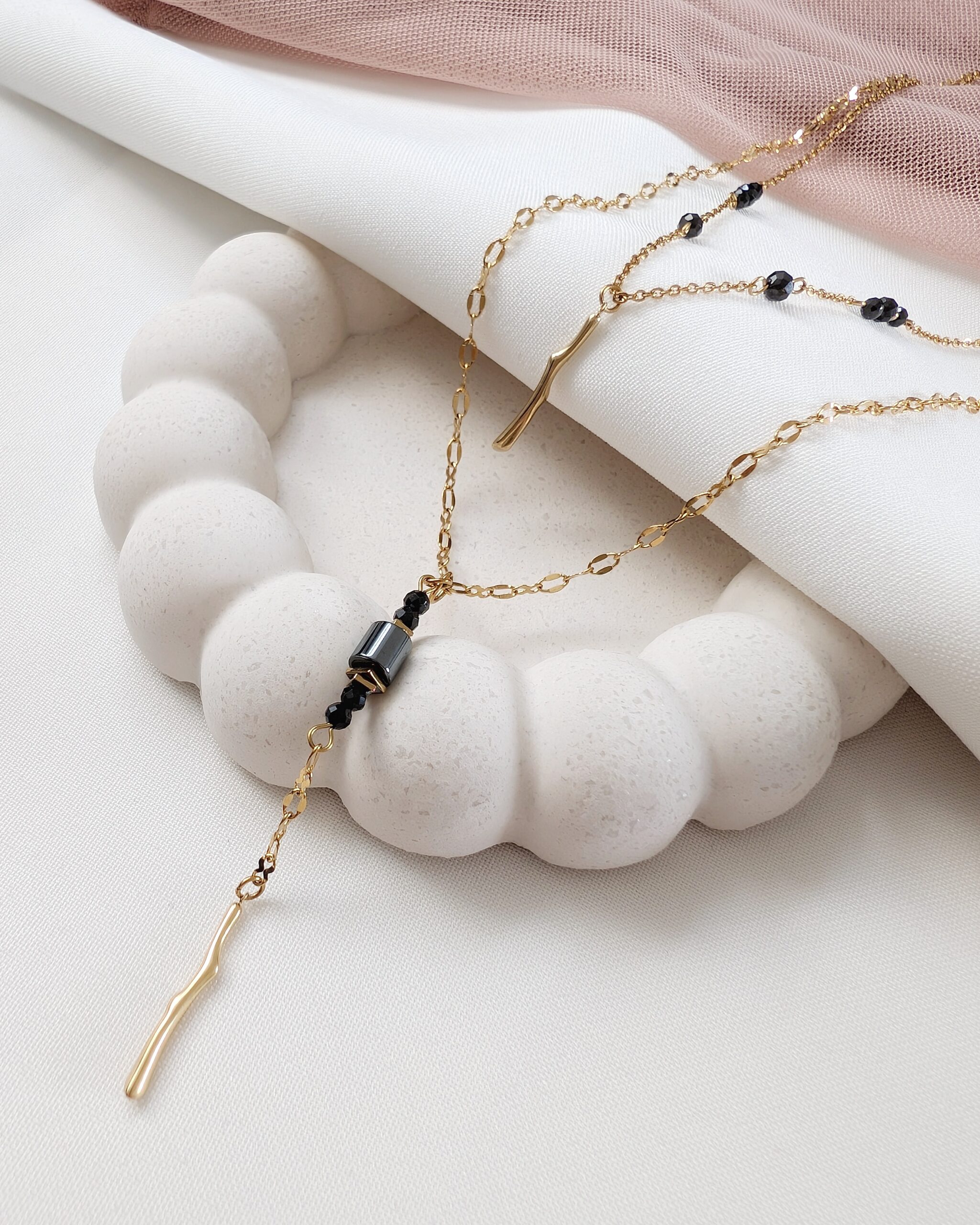 Podwójny naszyjnik z czarnym turmalinem hematytem na bazie złotych łańcuszków ze stali chirurgicznej.