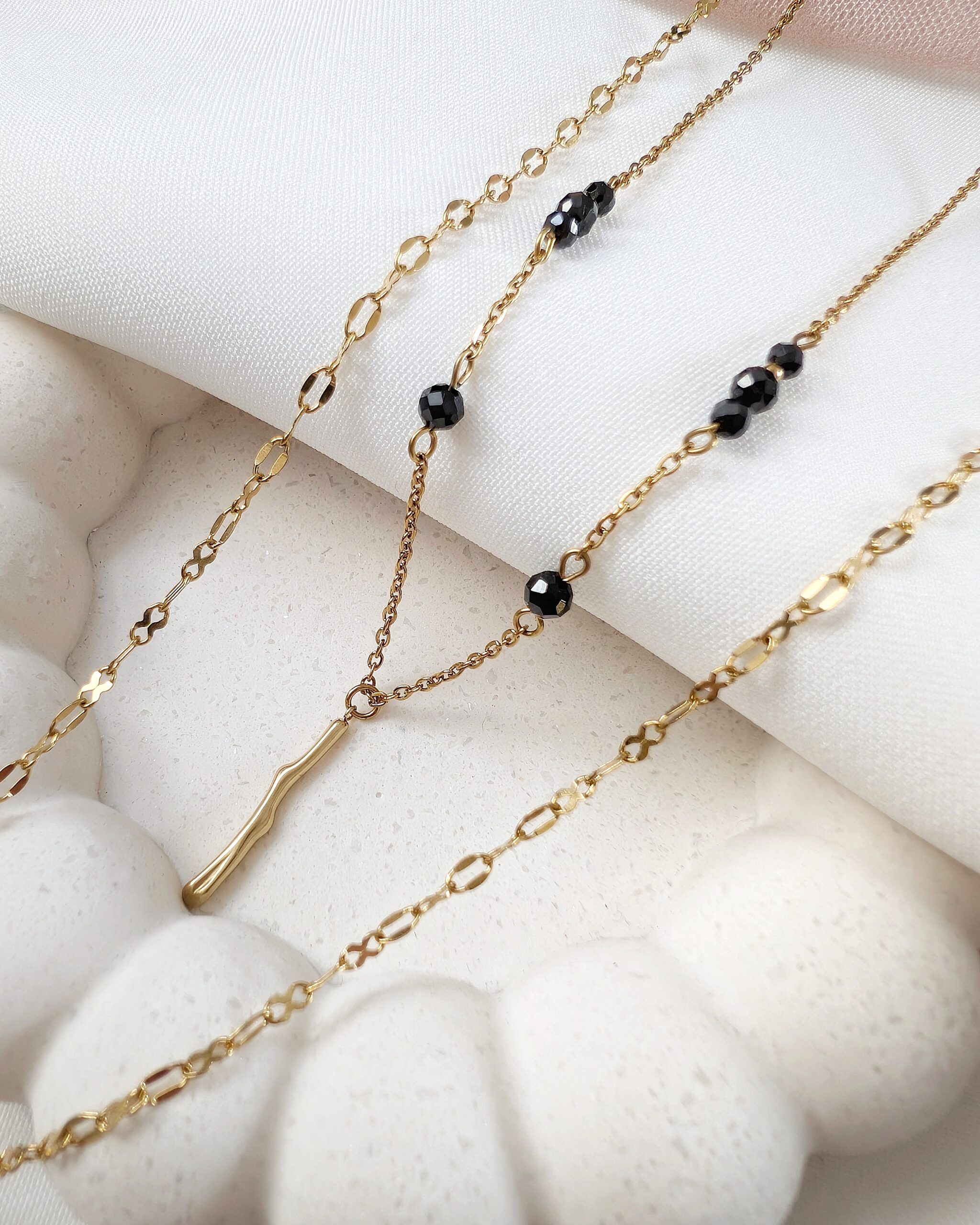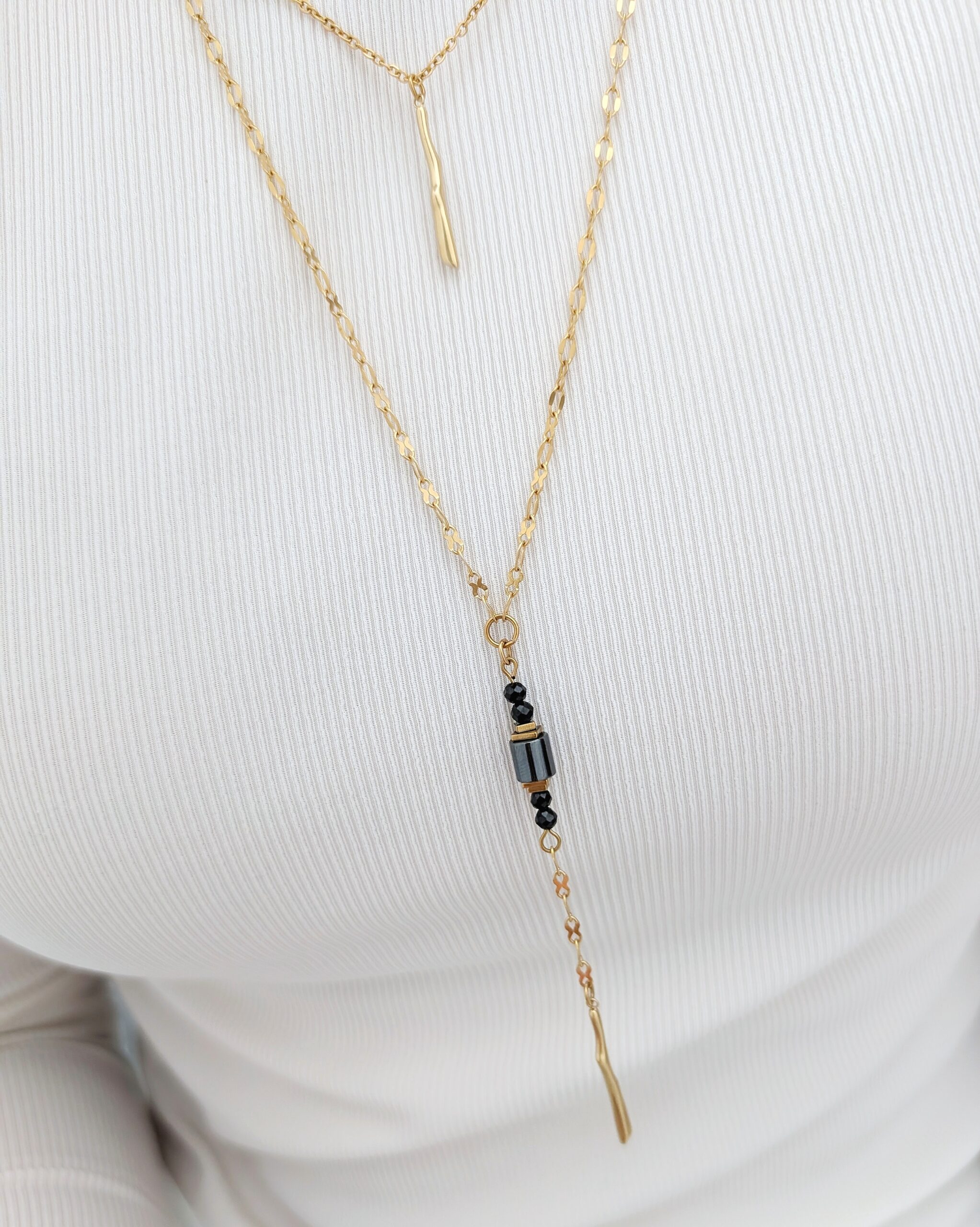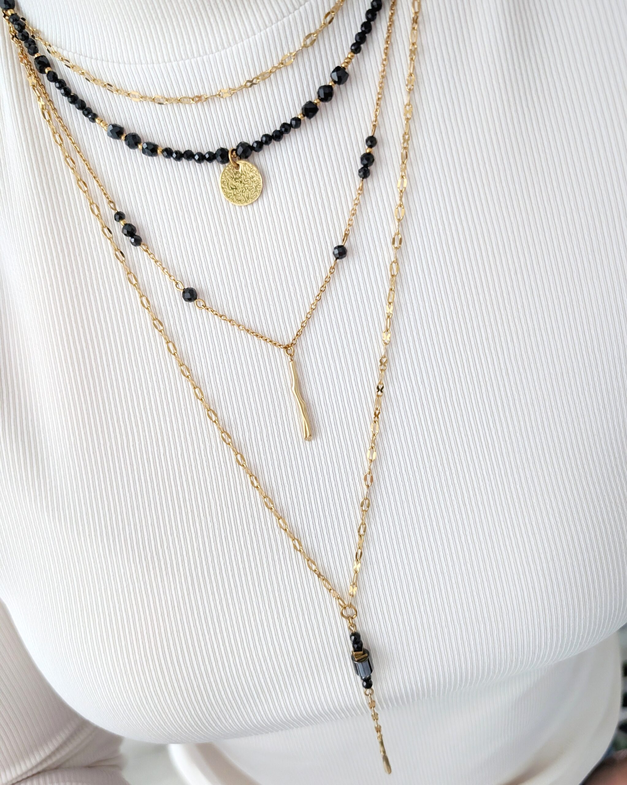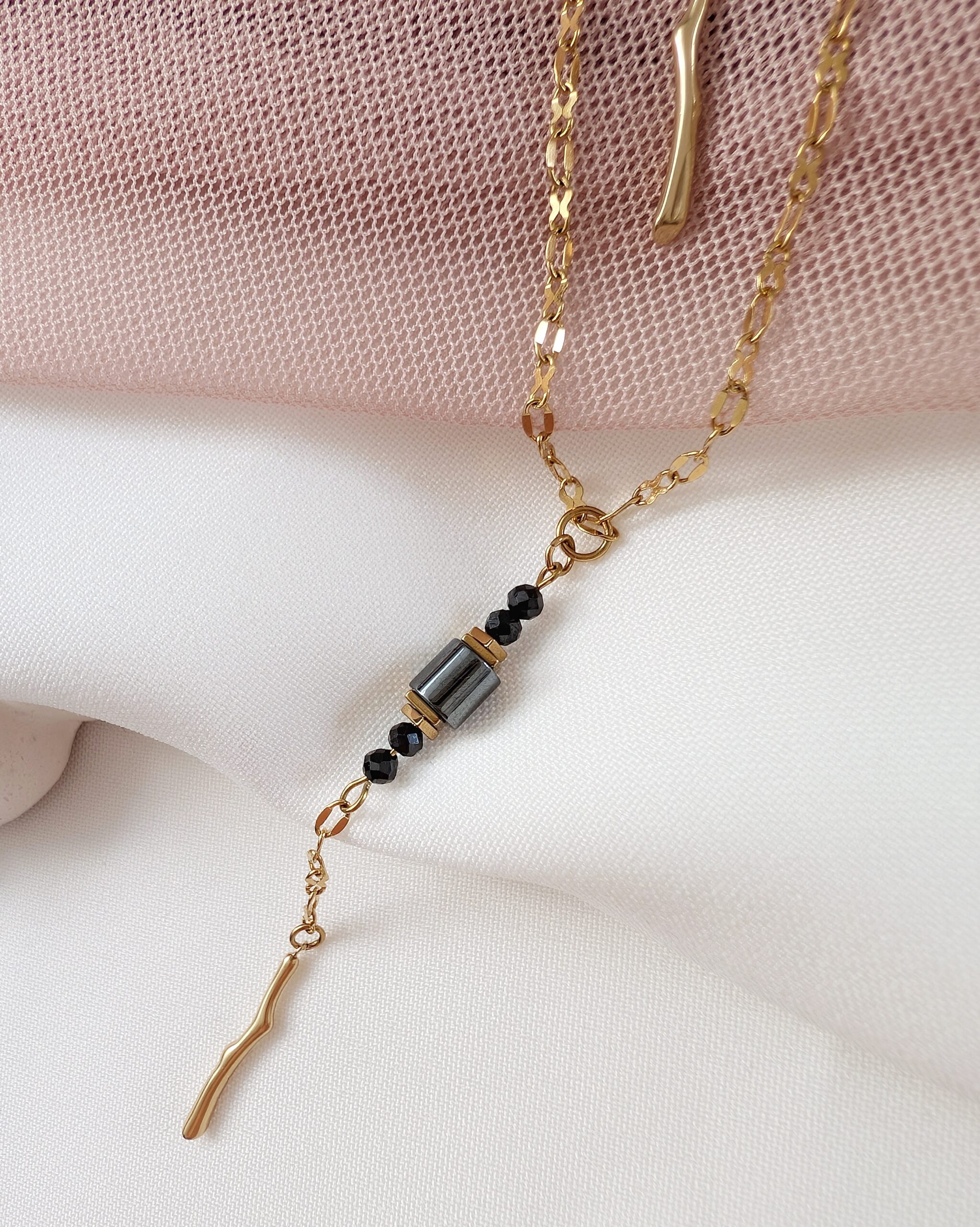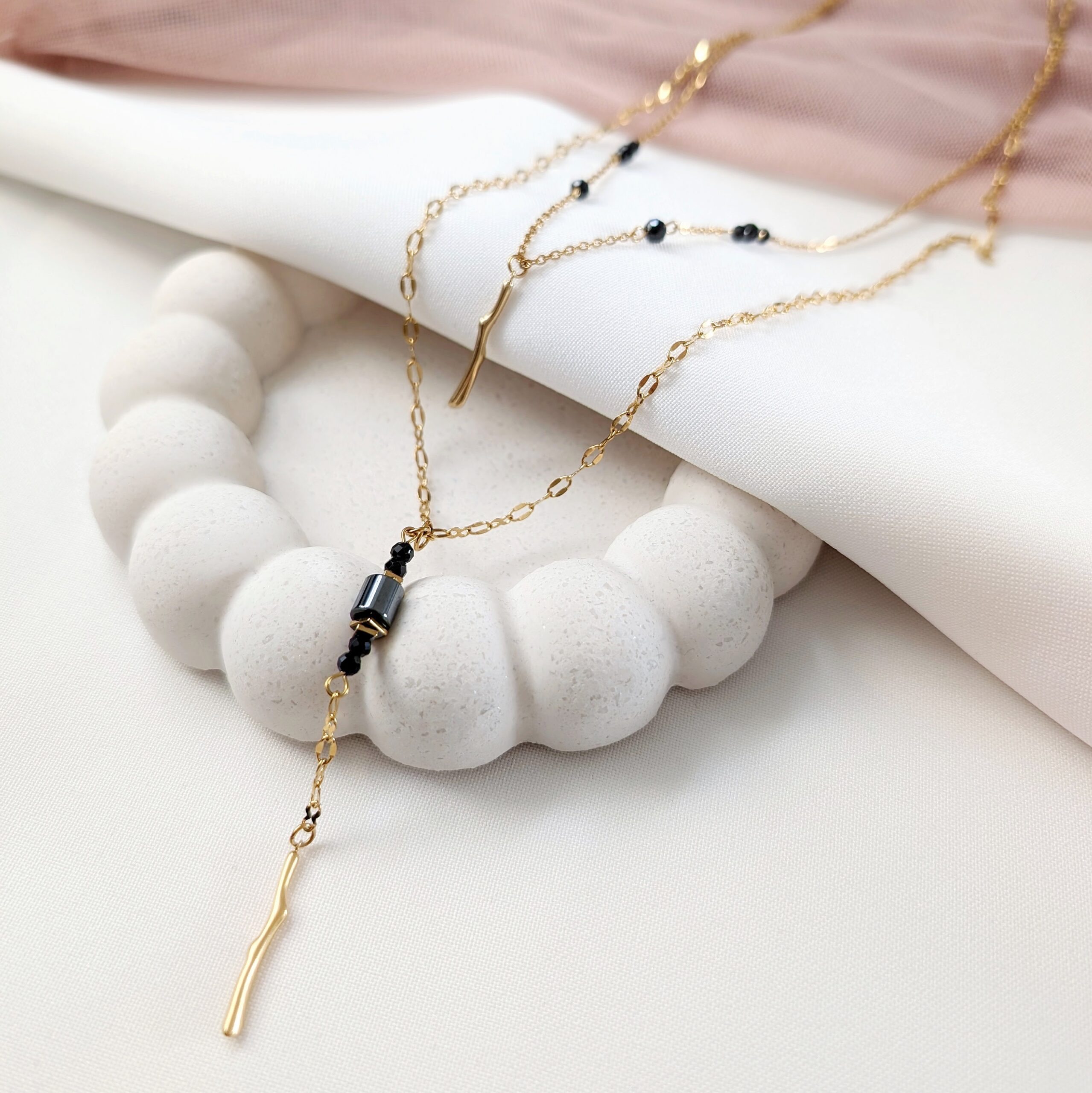 Podwójny naszyjnik z czarnym turmalinem hematytem na bazie złotych łańcuszków ze stali chirurgicznej.