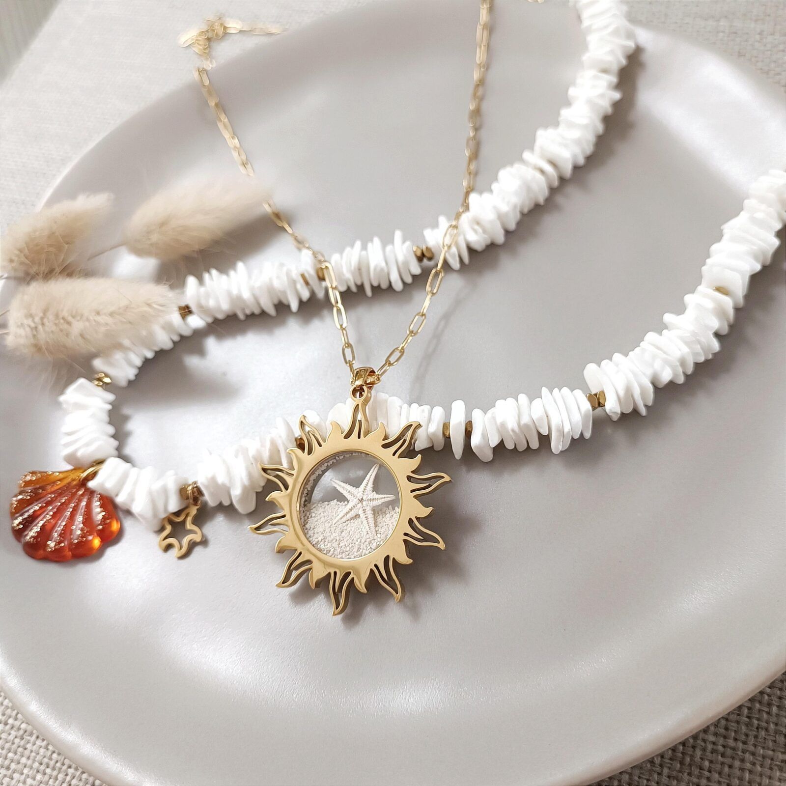 Dostępny jest również kamień granat, amazonit, opal, howlit, bursztyn bałtycki oraz piasek z rozgwiazdą.