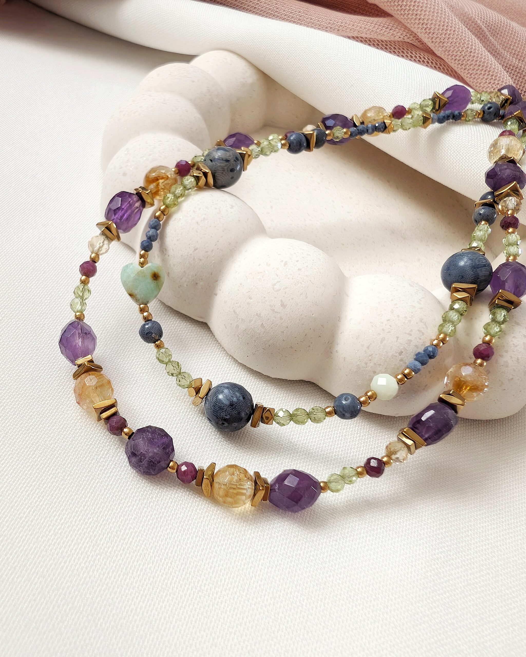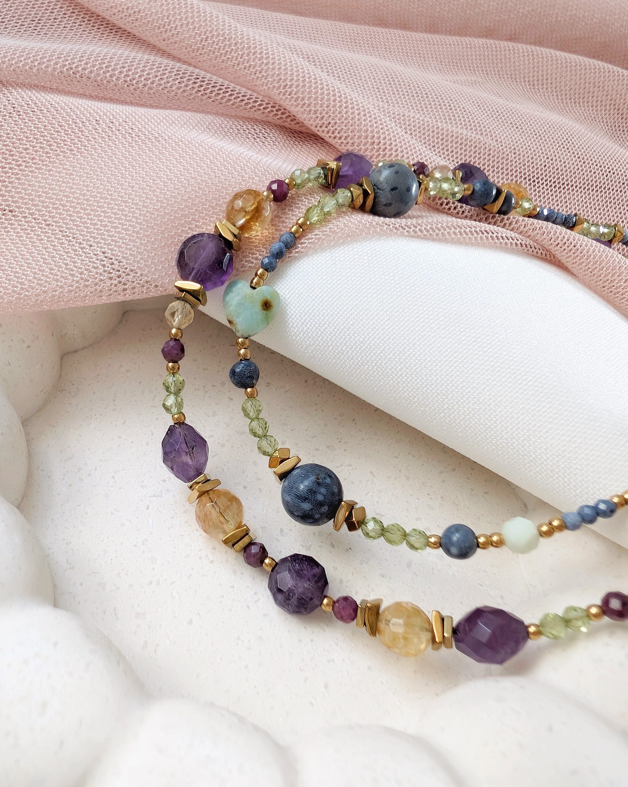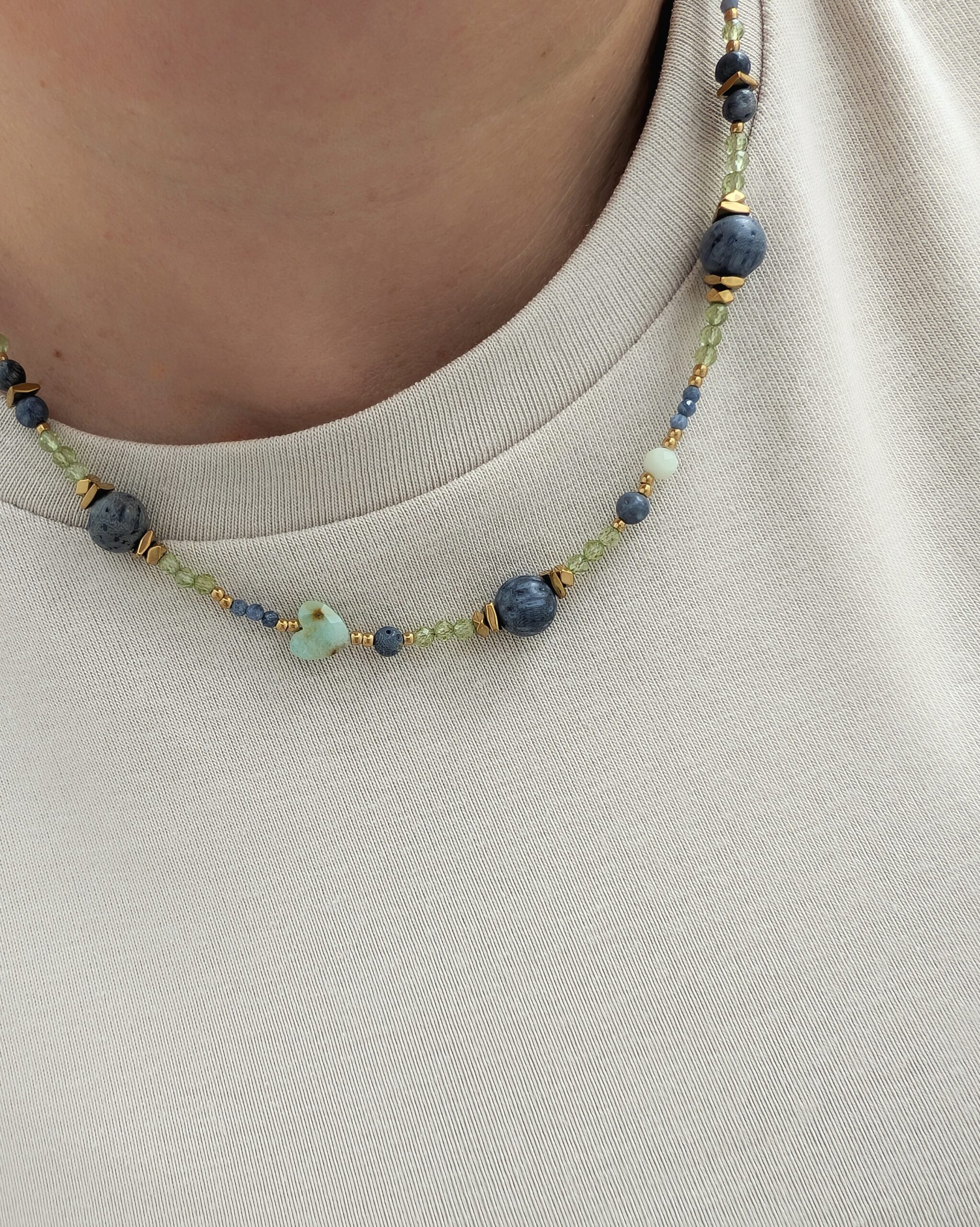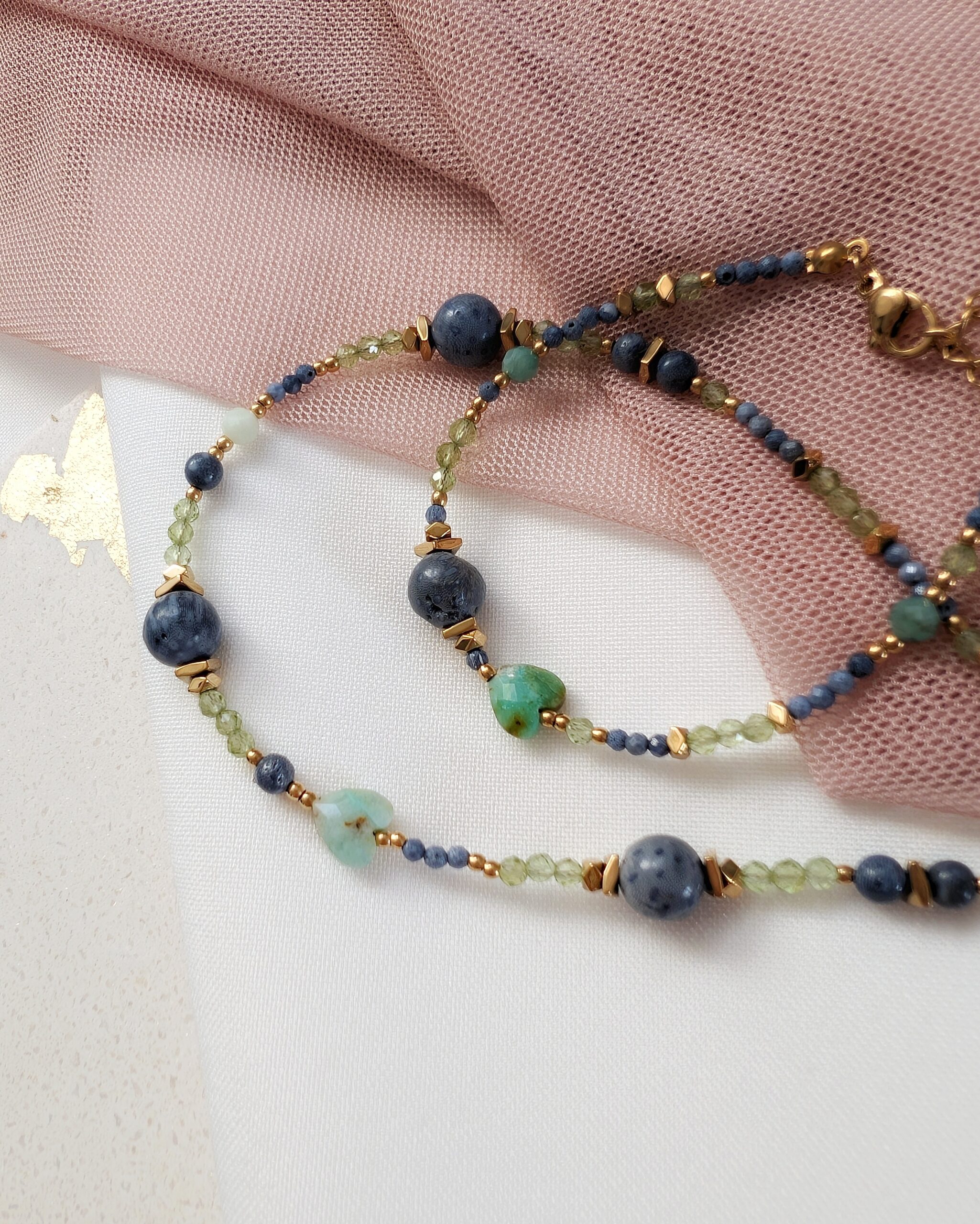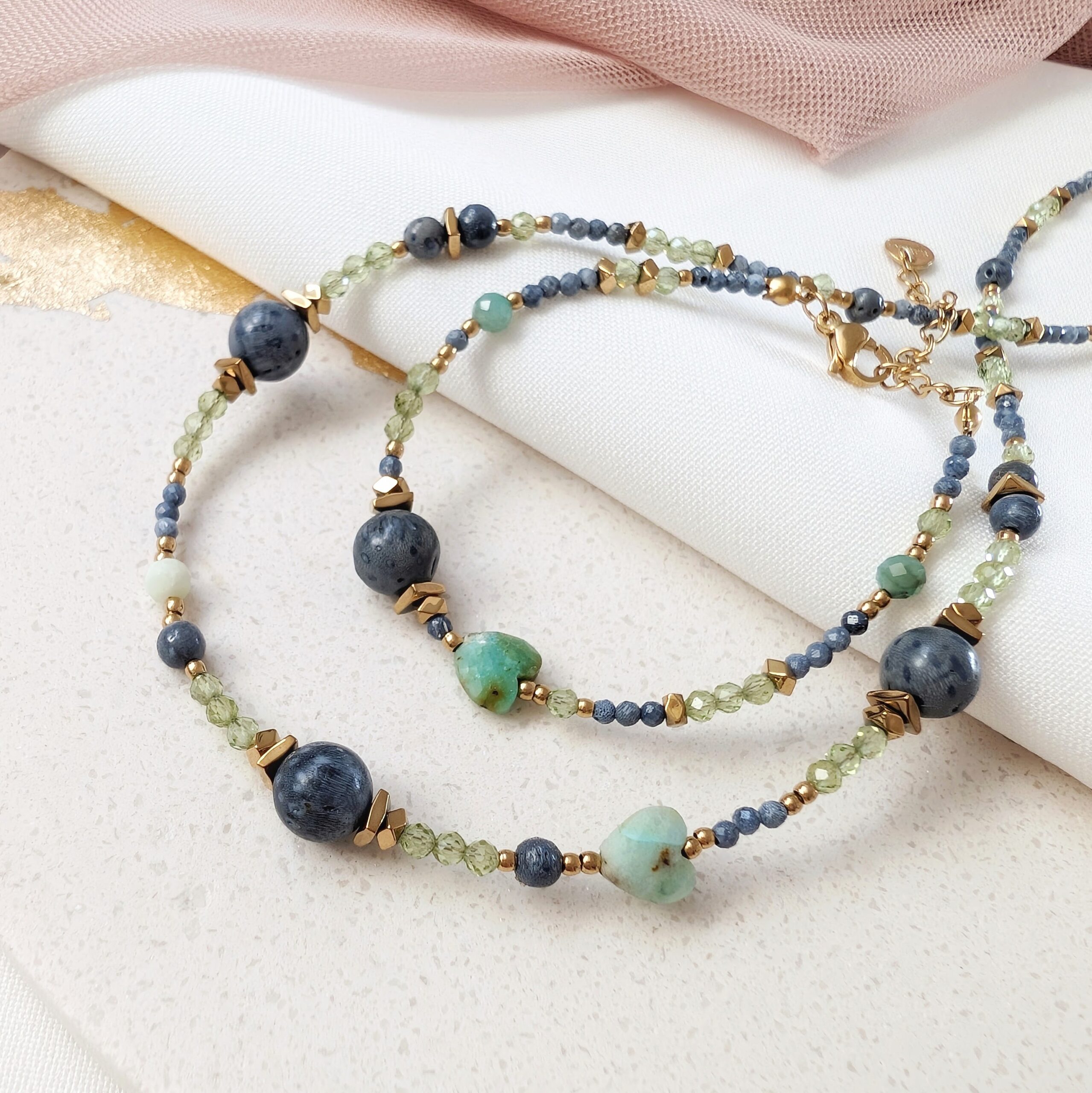 Komplet biżuterii wykonany z kamieni naturalnych: koral niebieski, oliwin, opal zielonyhematyt.