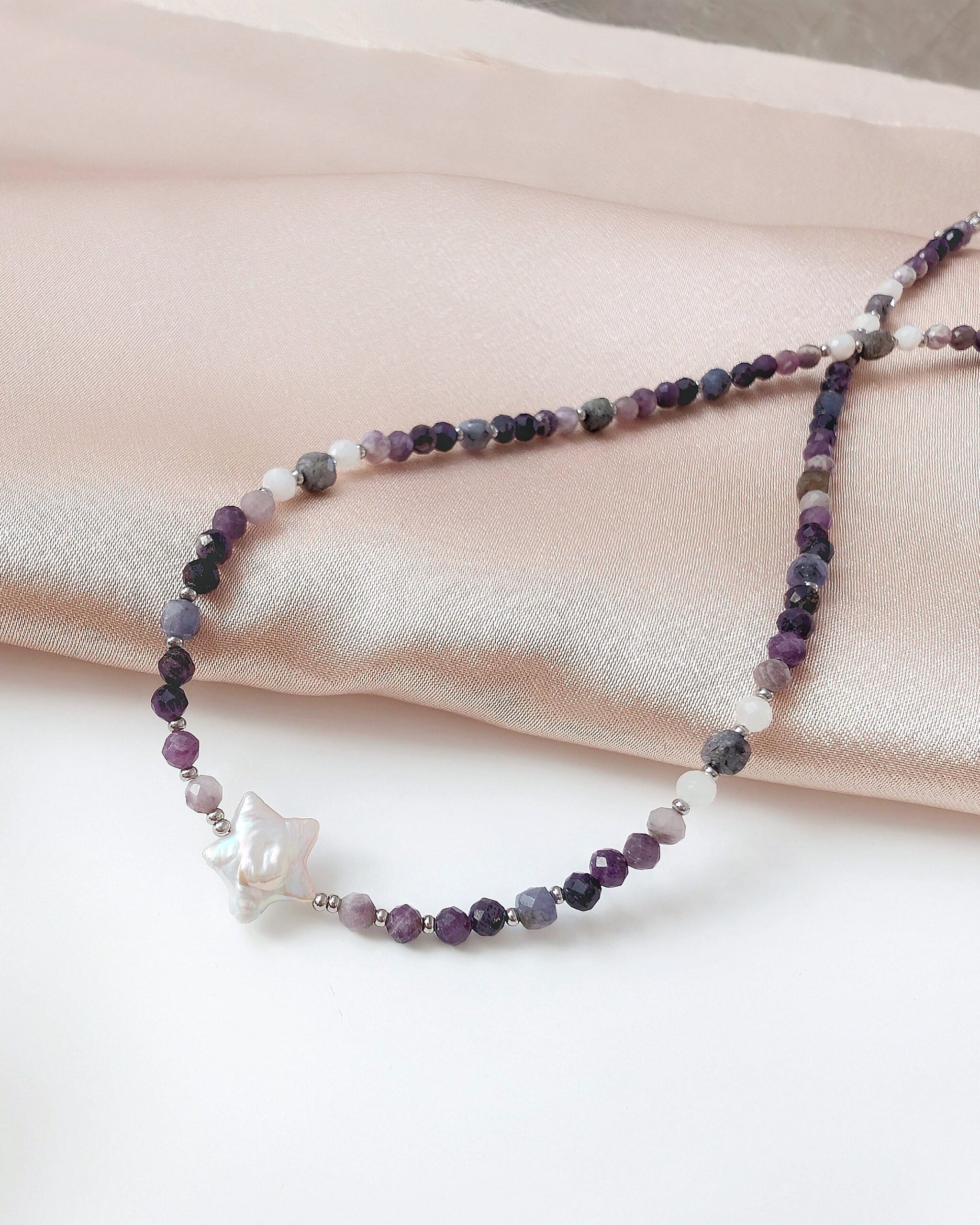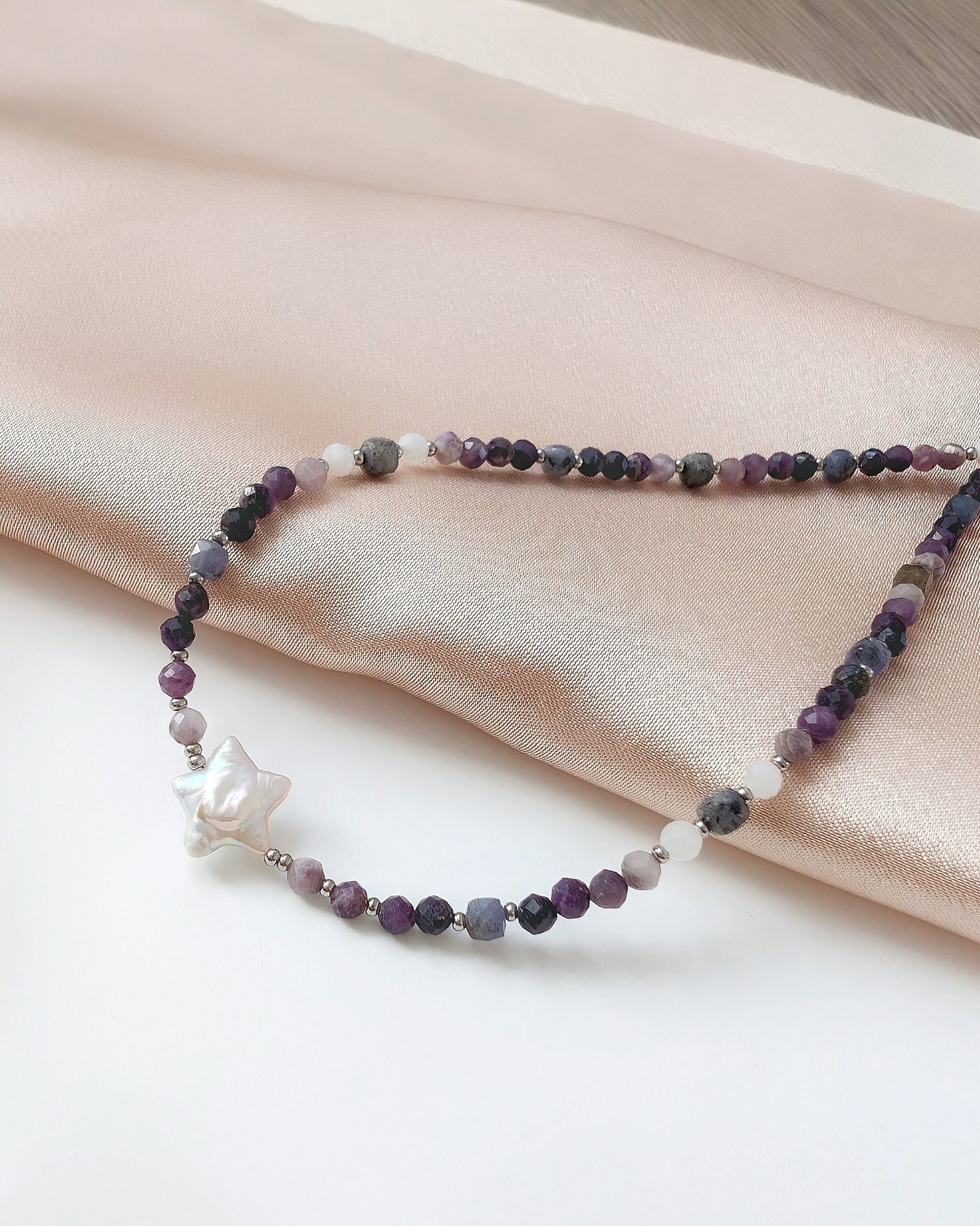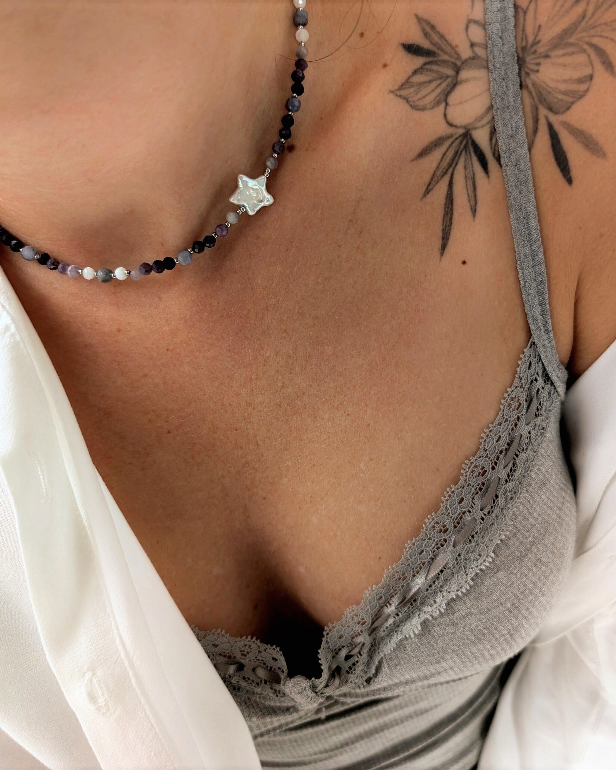 Oryginalny, unikatowy naszyjnik z kamieniami naturalnymi i perłą hodowaną słodkowodną.