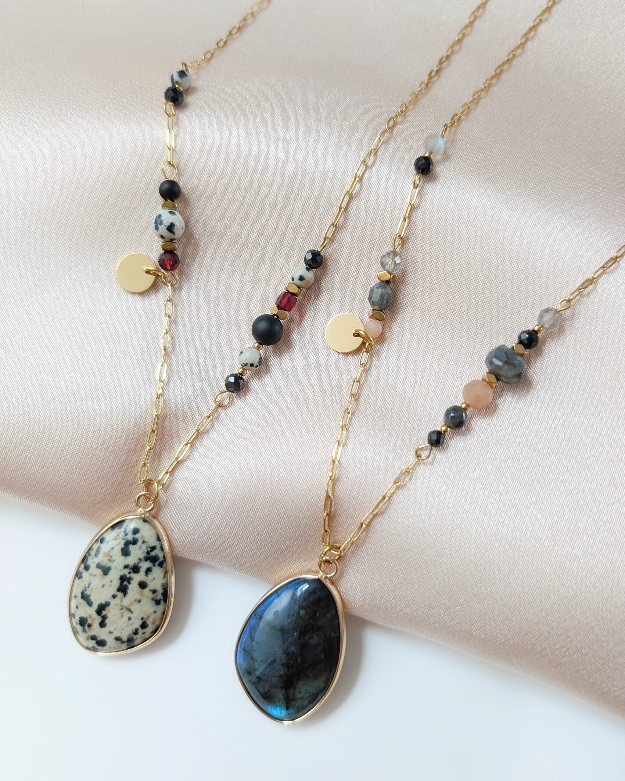 Naszyjnik z jaspisem dalmatyńskim oraz naszyjnik z labradorytem.