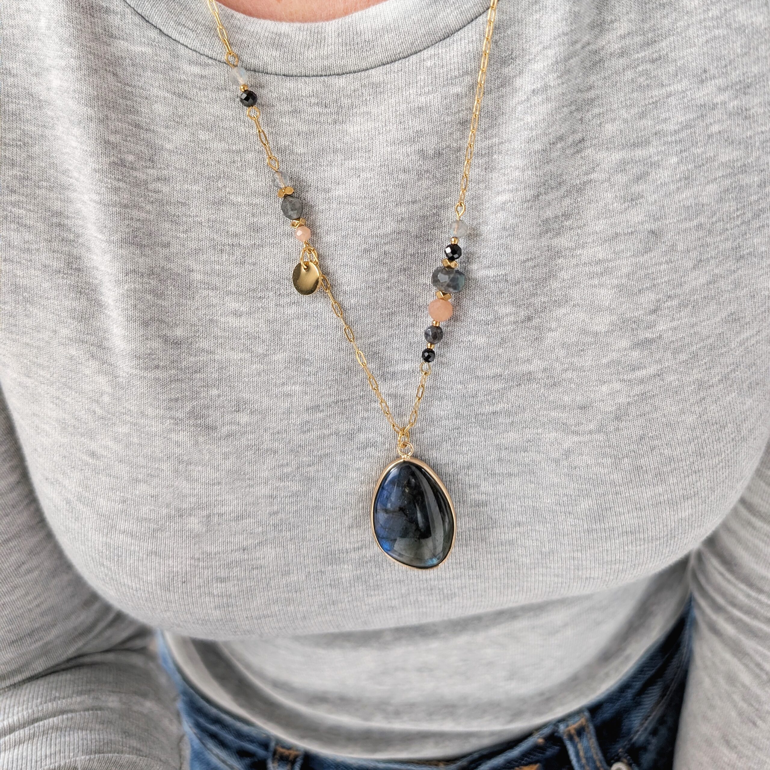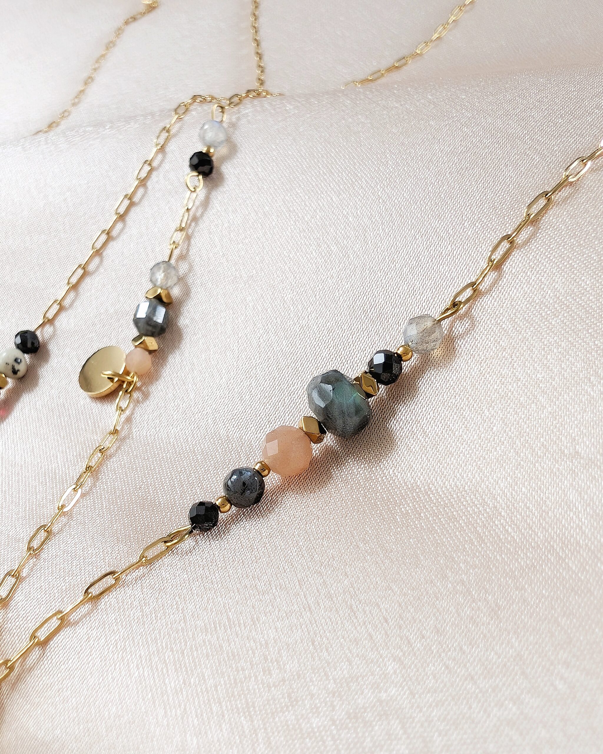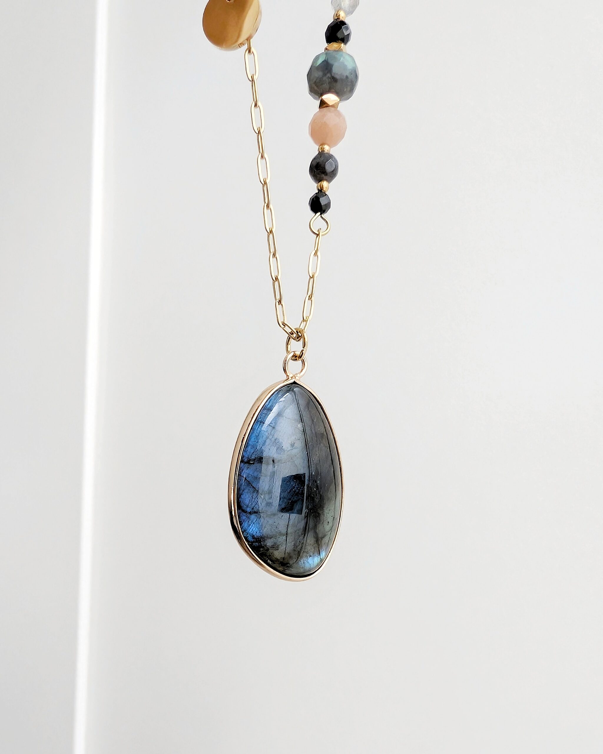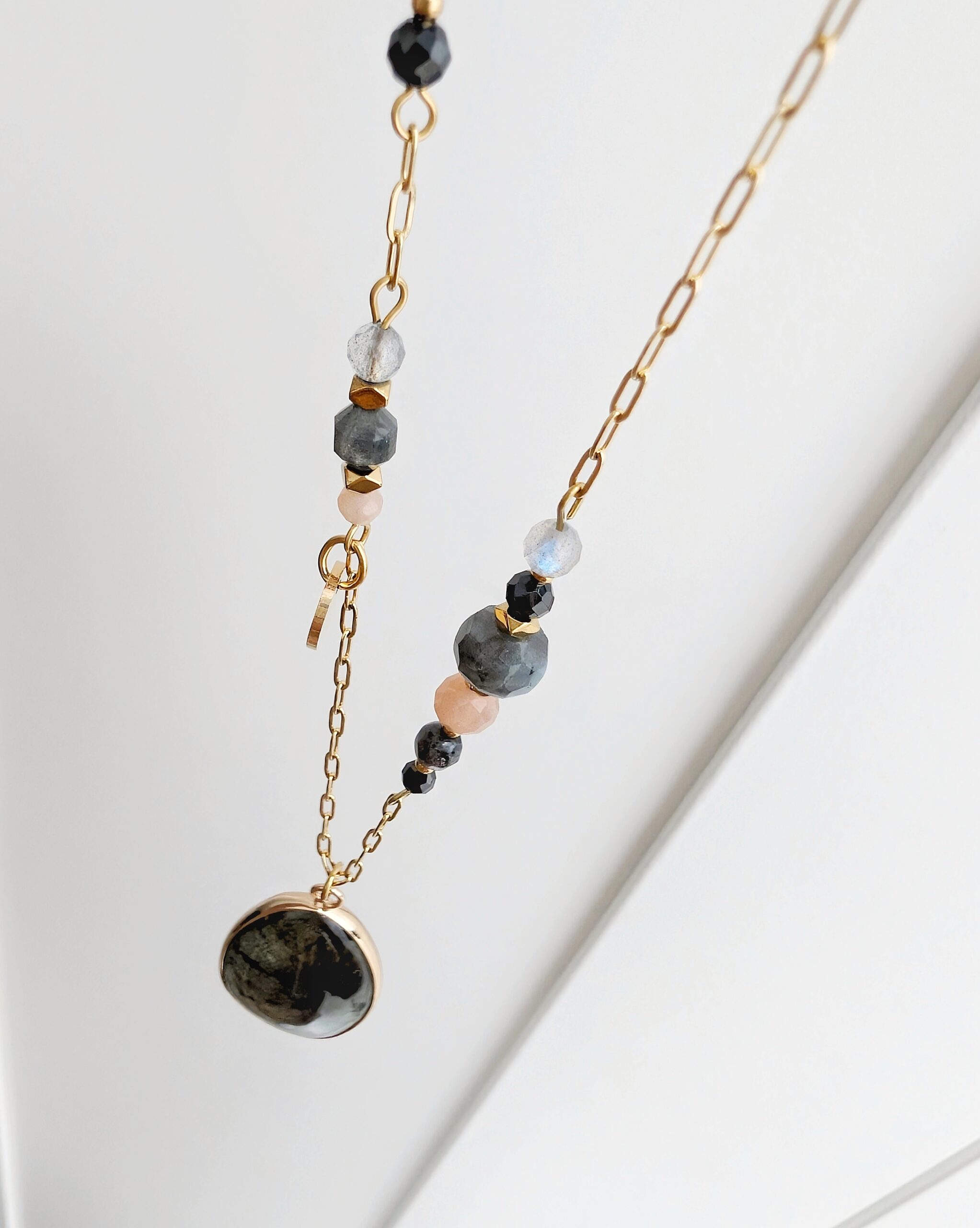 2. Zawieszka labradoryt: Kamienie pomiędzy łańcuszkiem: labradoryt, kamień słoneczny, spinel, hematyt.