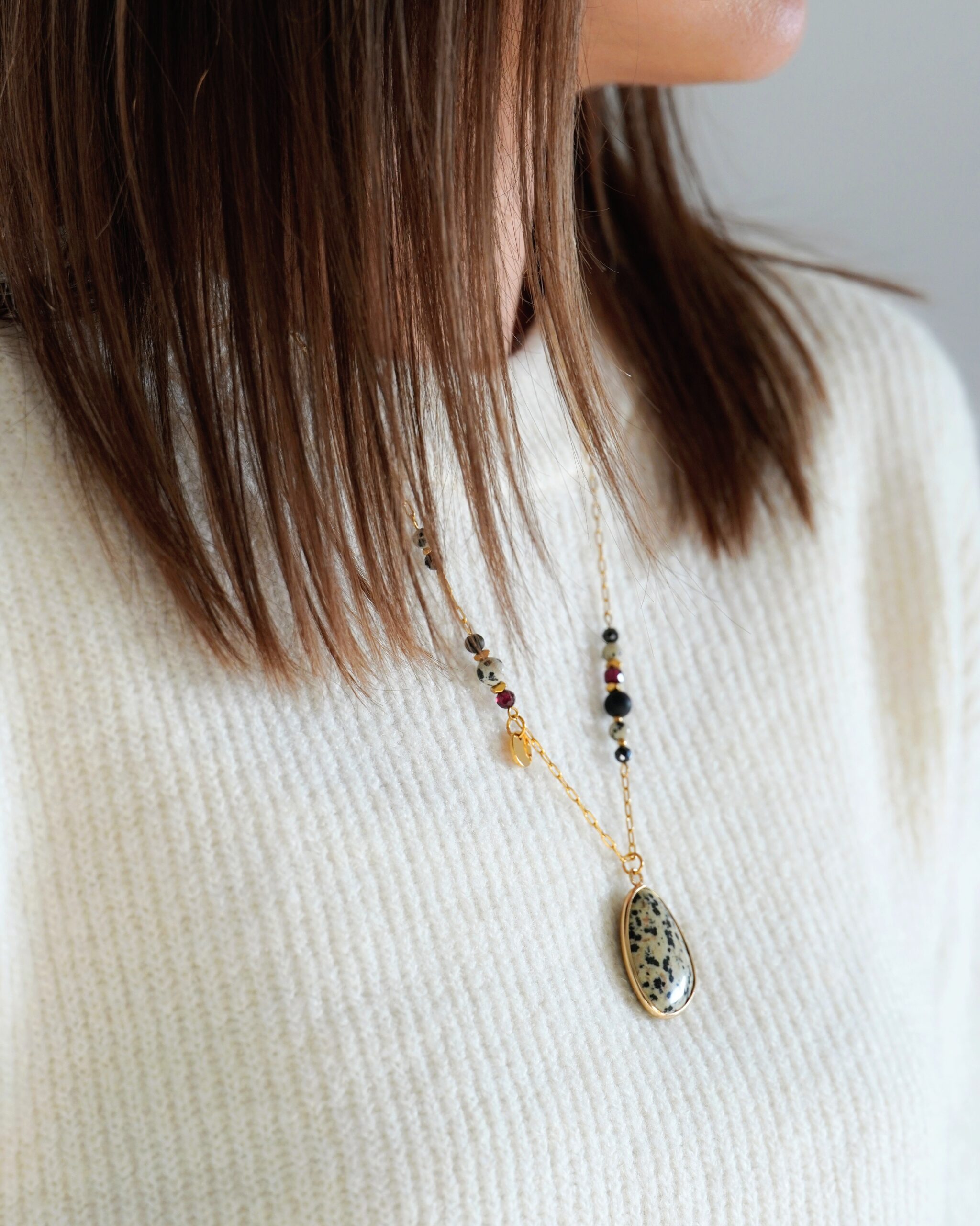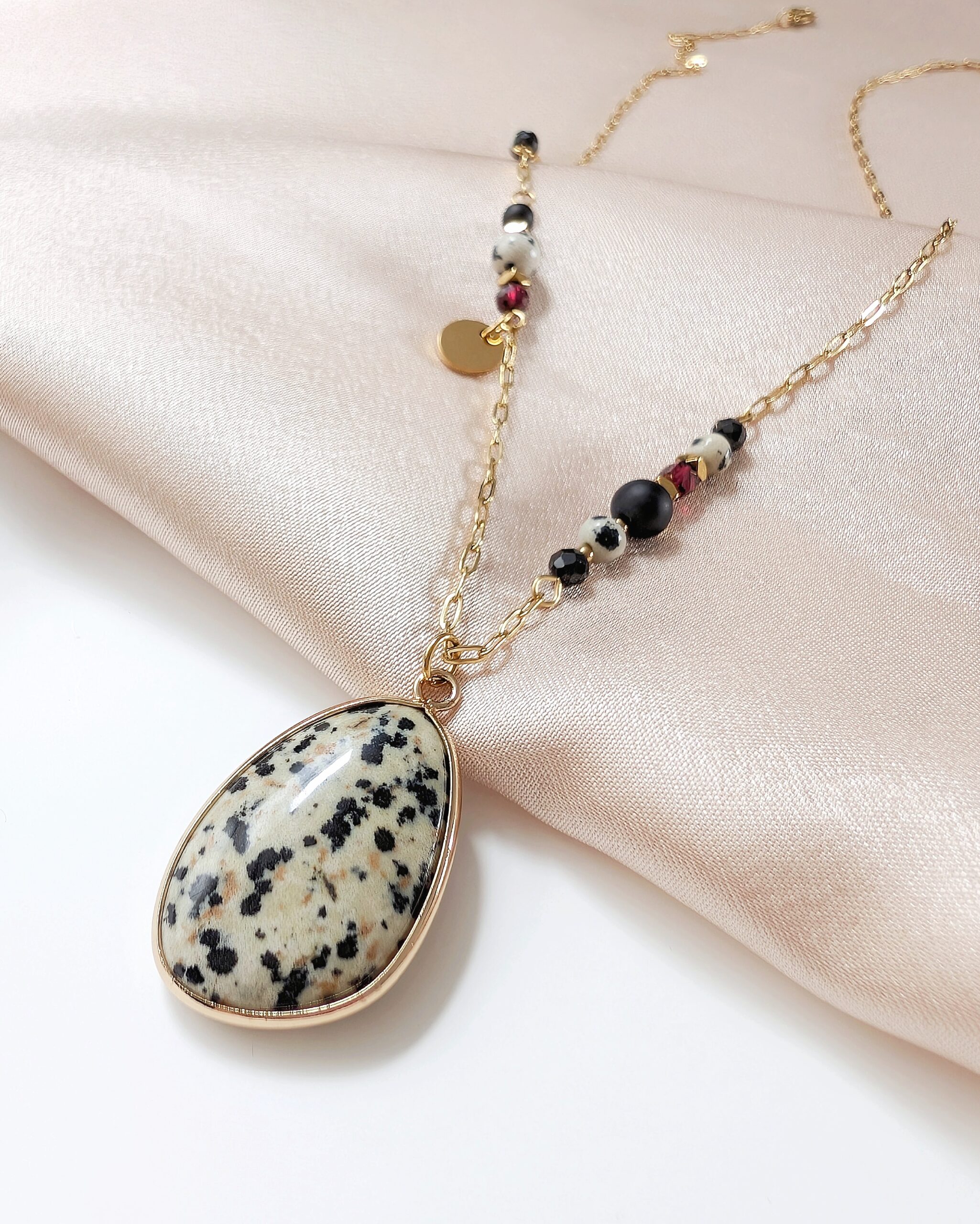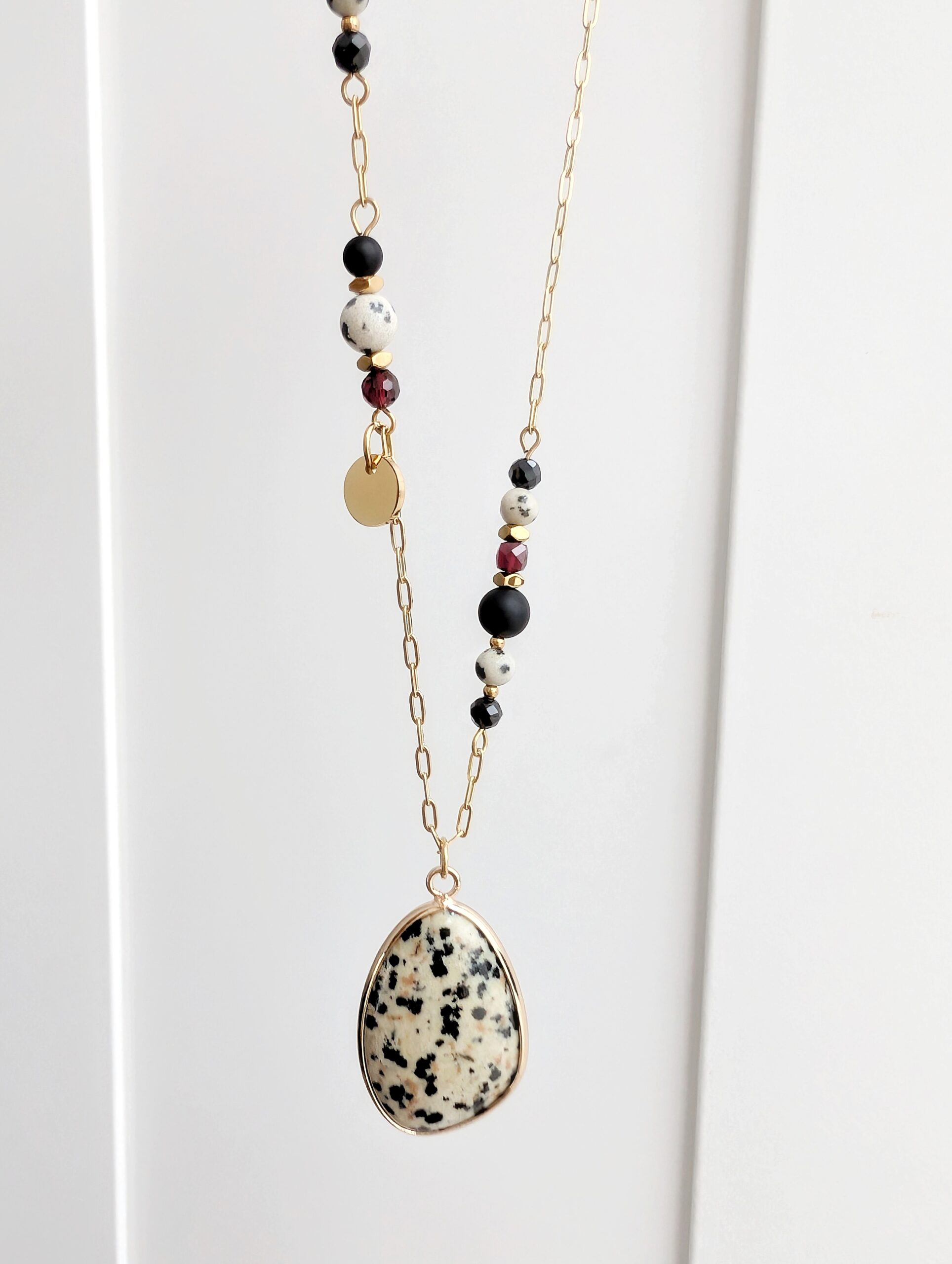 1. Zawieszka jaspis dalmatyński. Kamienie pomiędzy łańcuszkiem: onyks, jaspis dalmatyński, granat, spinel, hematyt.
