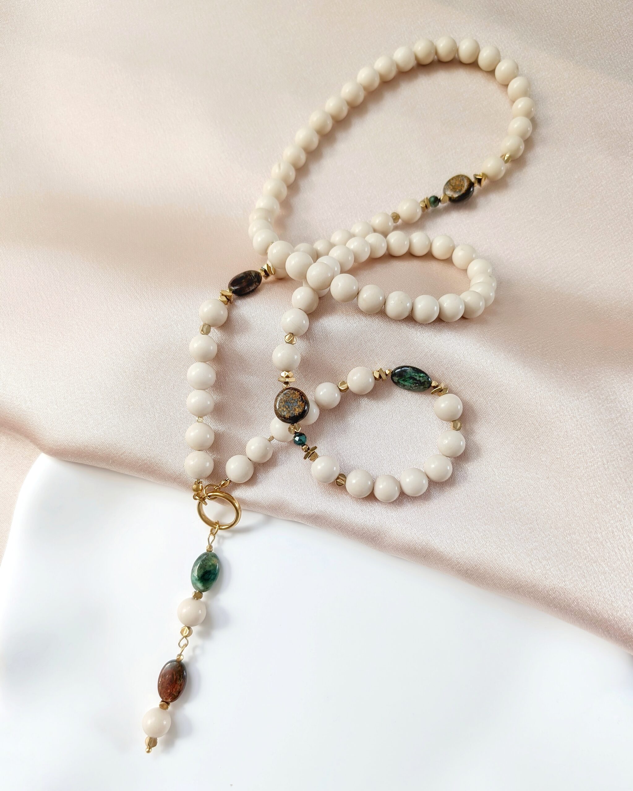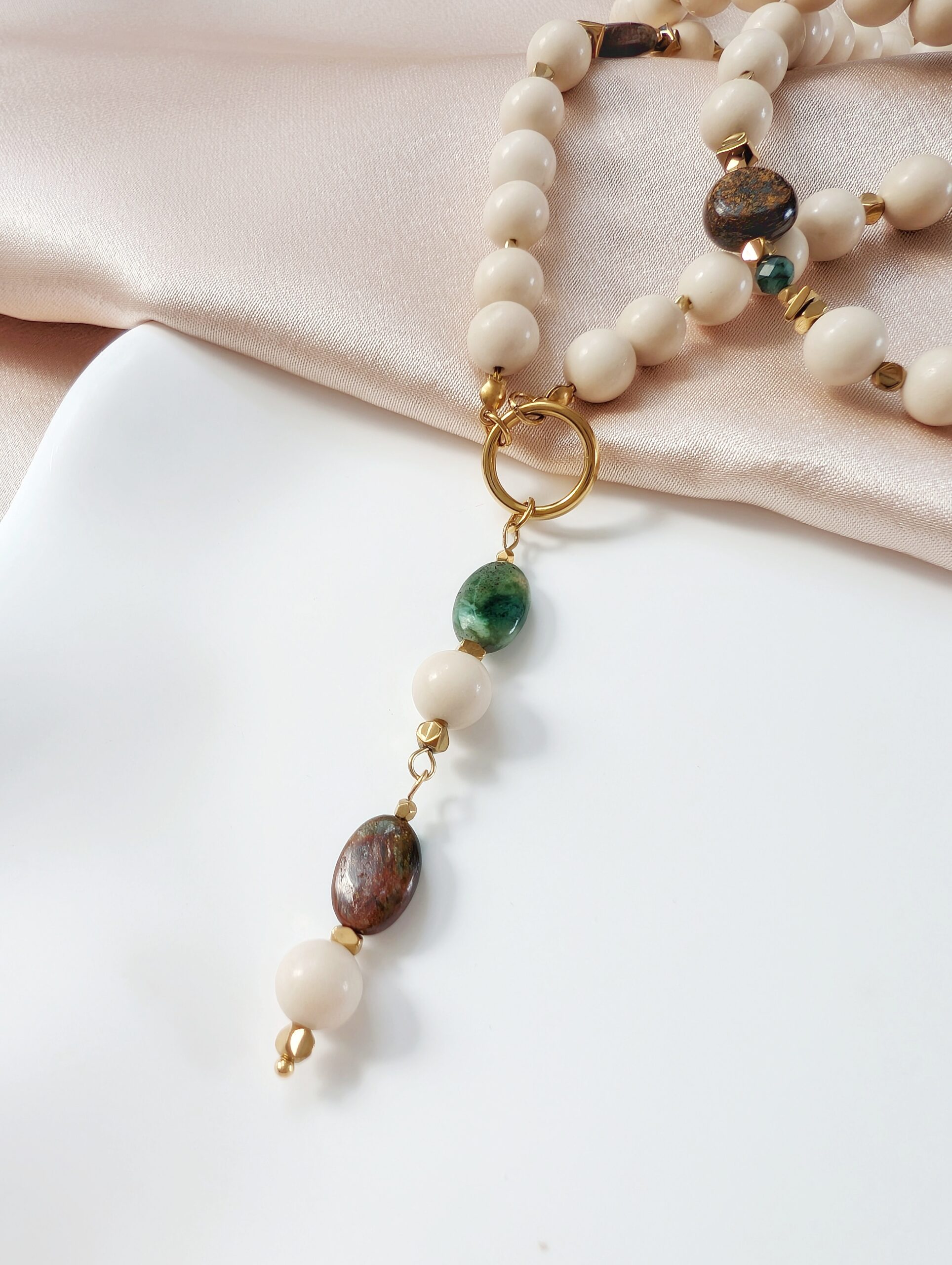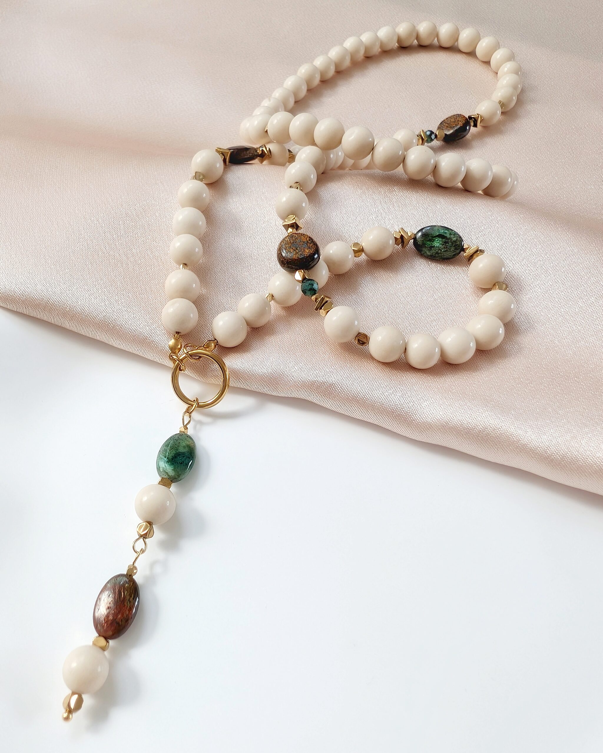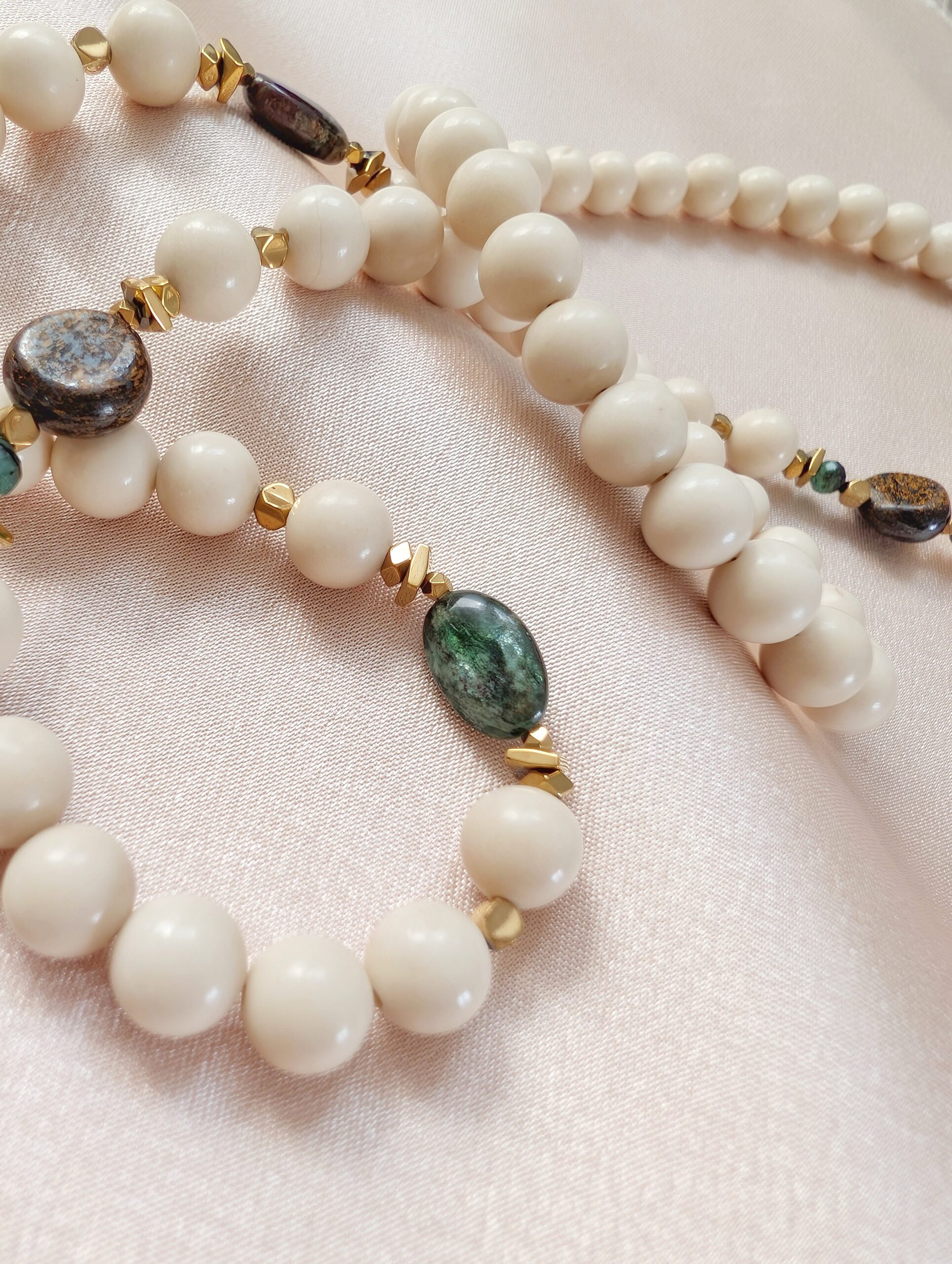 Naszyjnik wykonany z kamieni naturalnych: kamień rzeczny, szmaragd, bronzyt, hematyt.