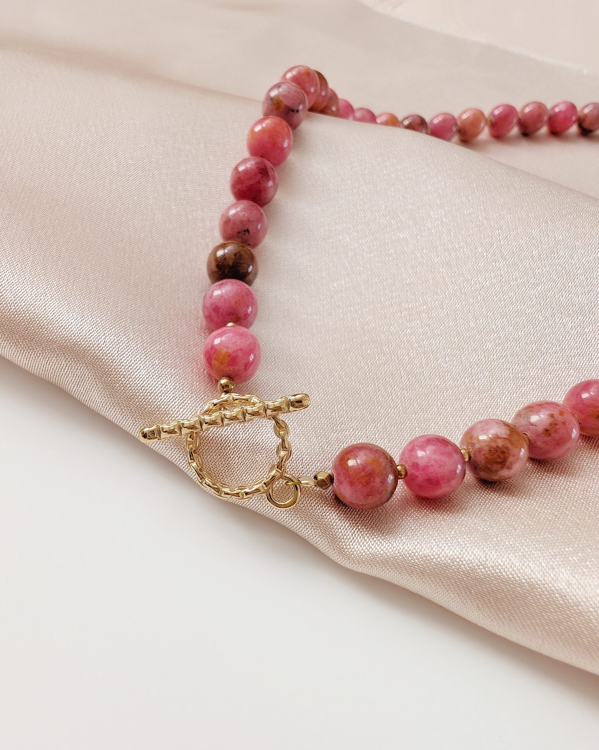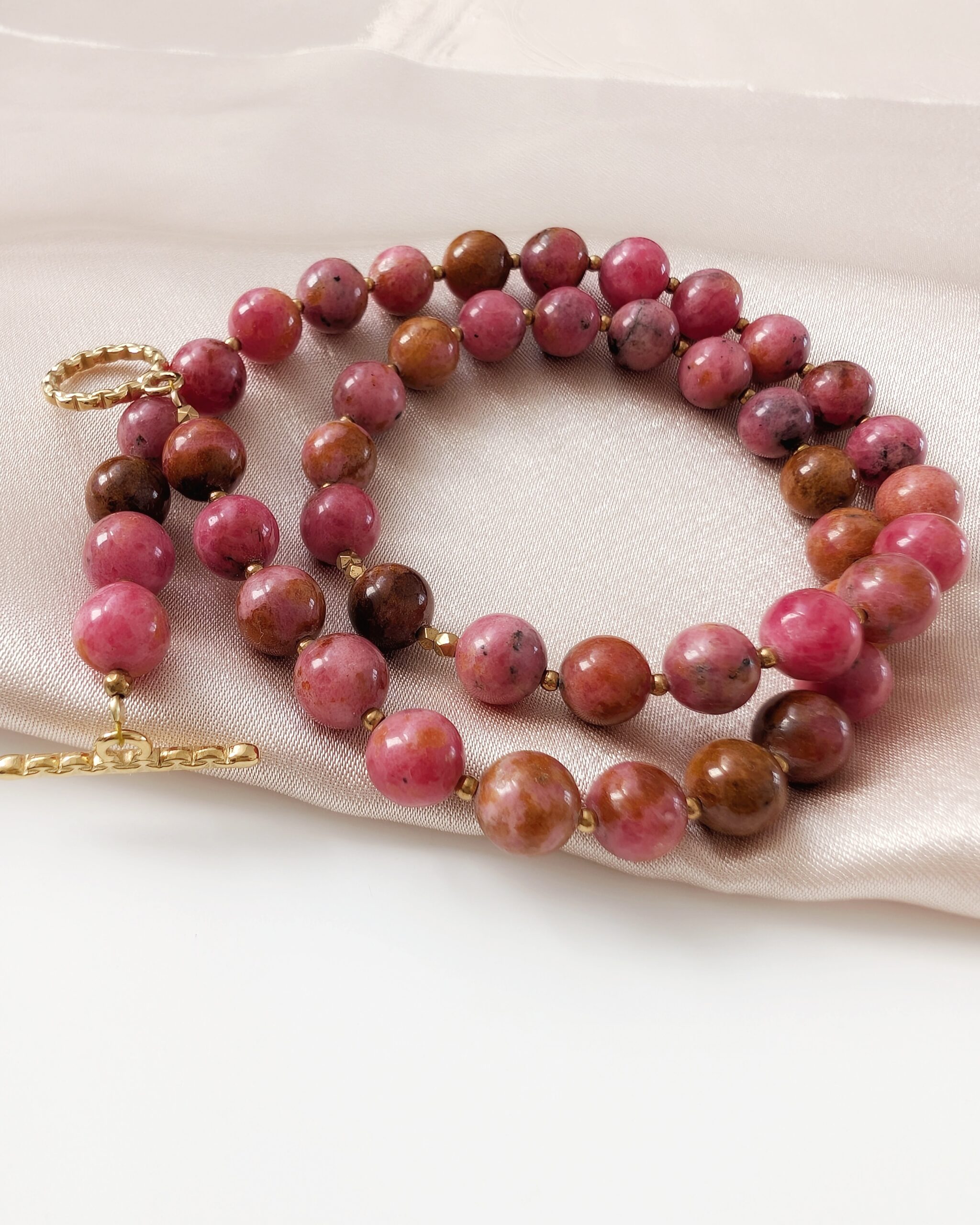 Kamień naturalny rodonit o niesamowicie zachwycających i oryginalnych kolorach. Kulki średnicy 8mm w odcieniach różowych, rudych, brązowych. Drobne kuleczki ze stali chirurgicznej w kolorze złotym.
