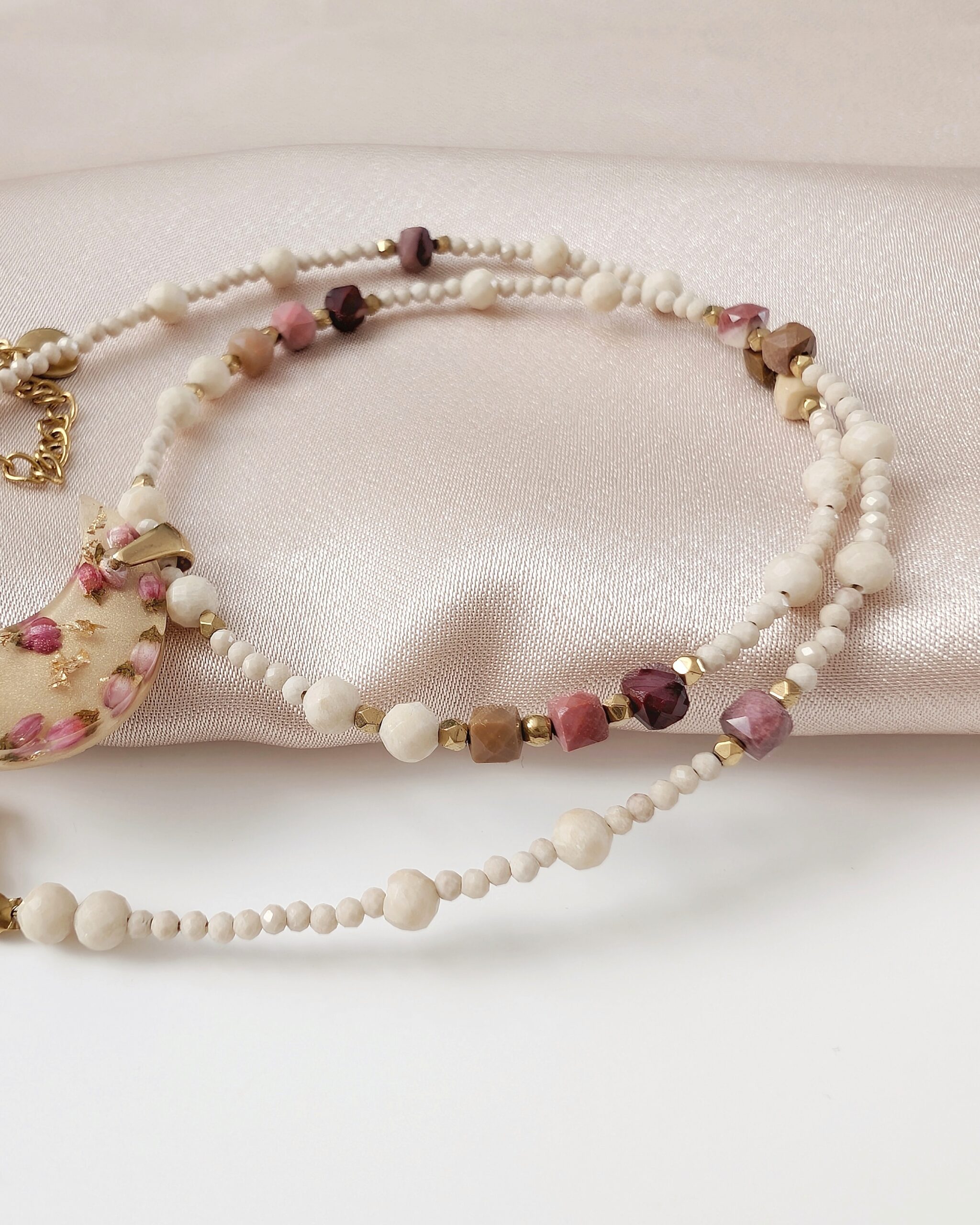 Kamienie naturalne: kamień rzeczny i mokait w kolorach beżu, różu, fioletu, które idealnie współgrają z zawieszką.