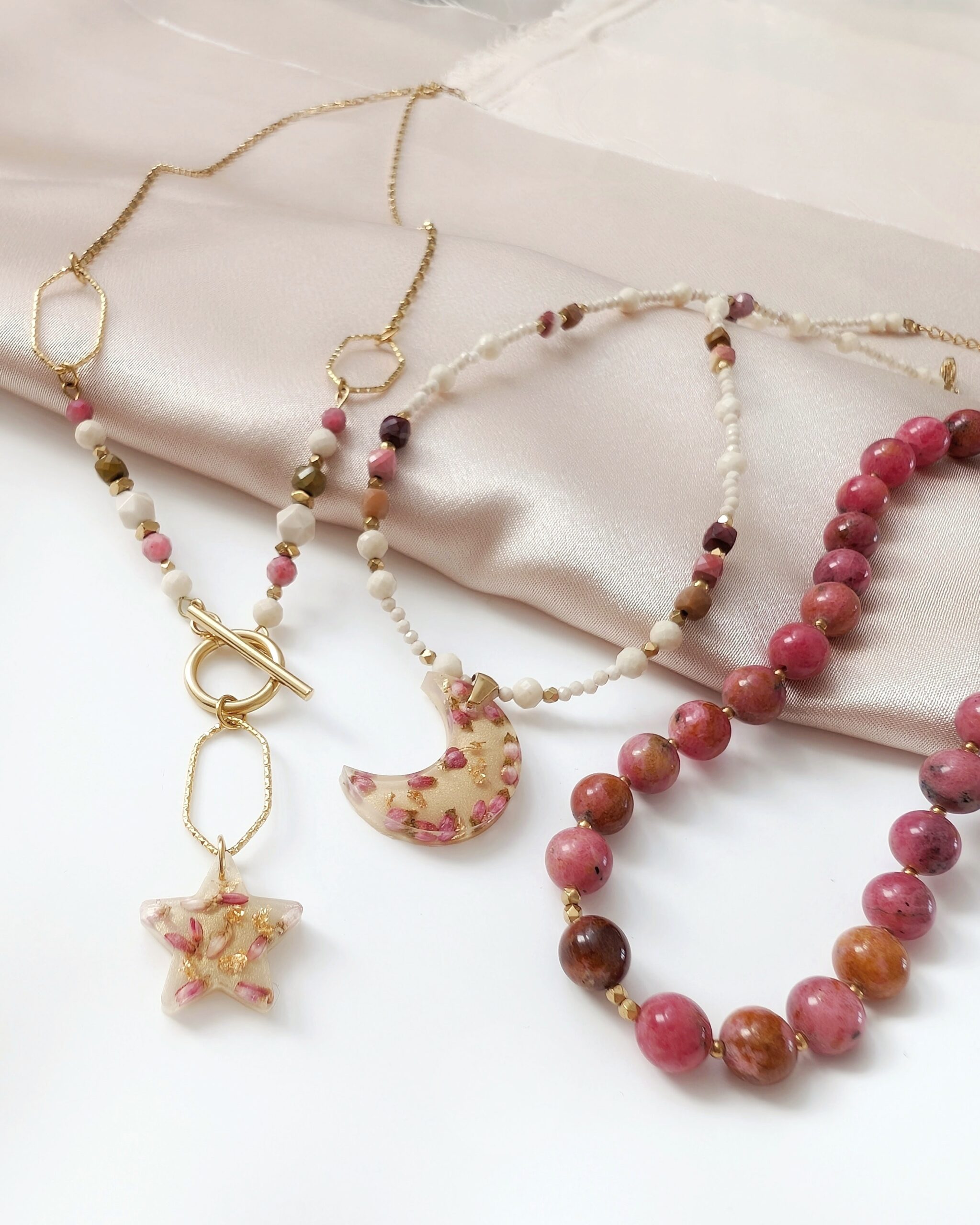 Kamienie naturalne: kamień rzeczny, rodonit, mokait.