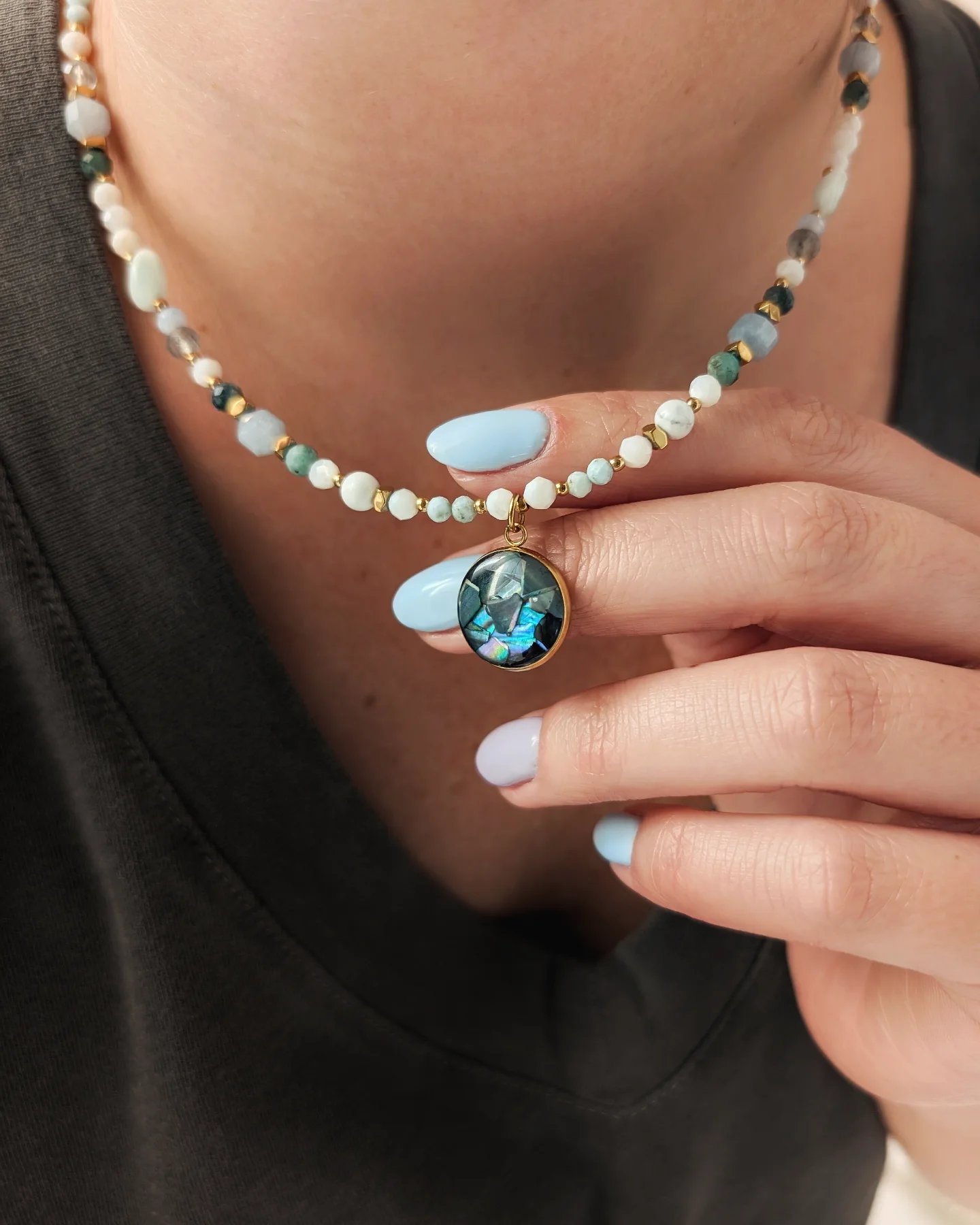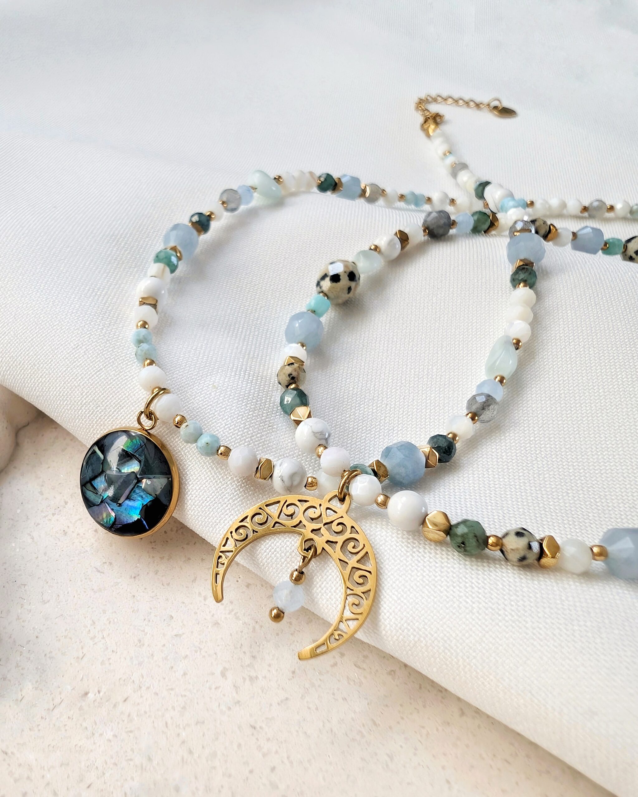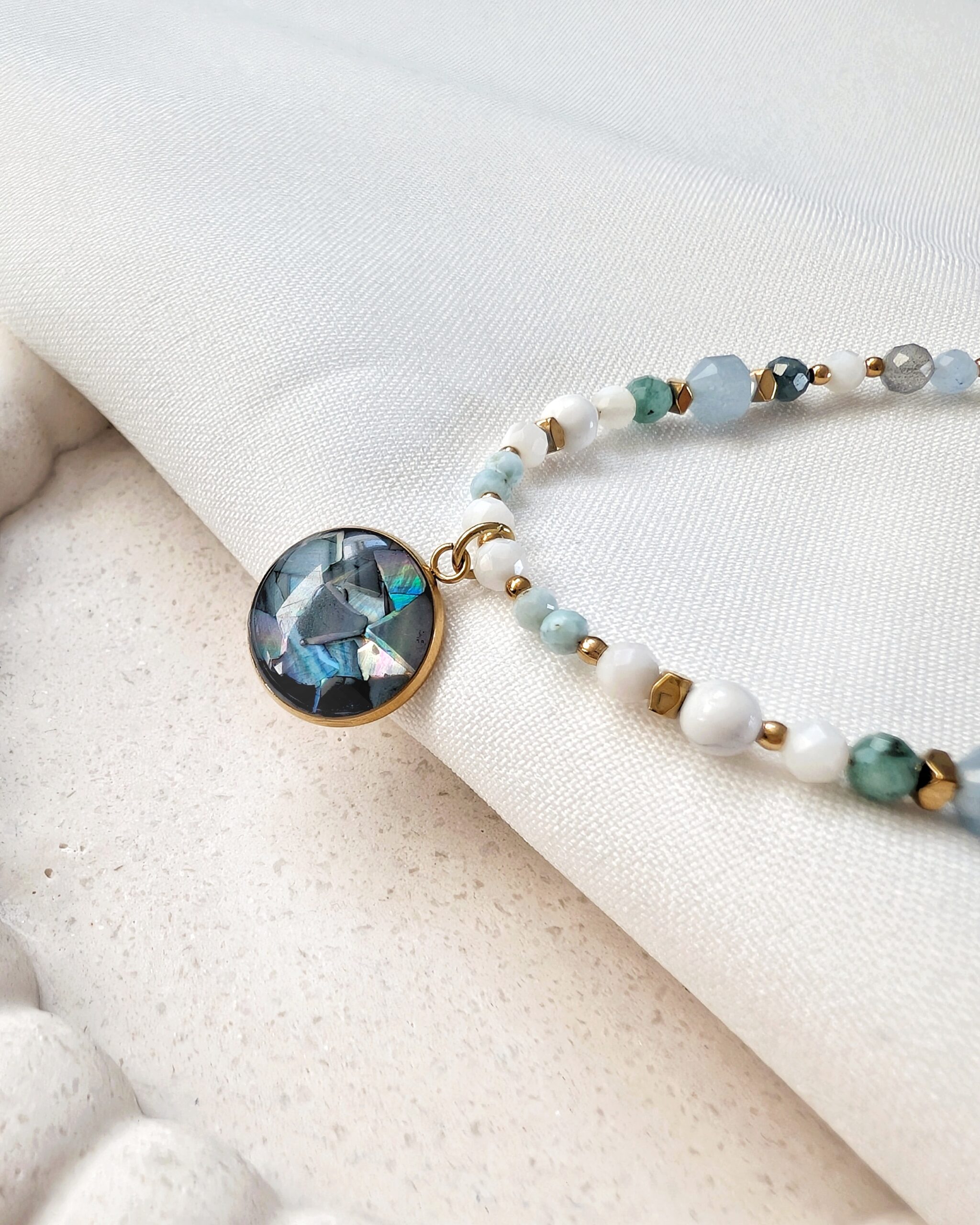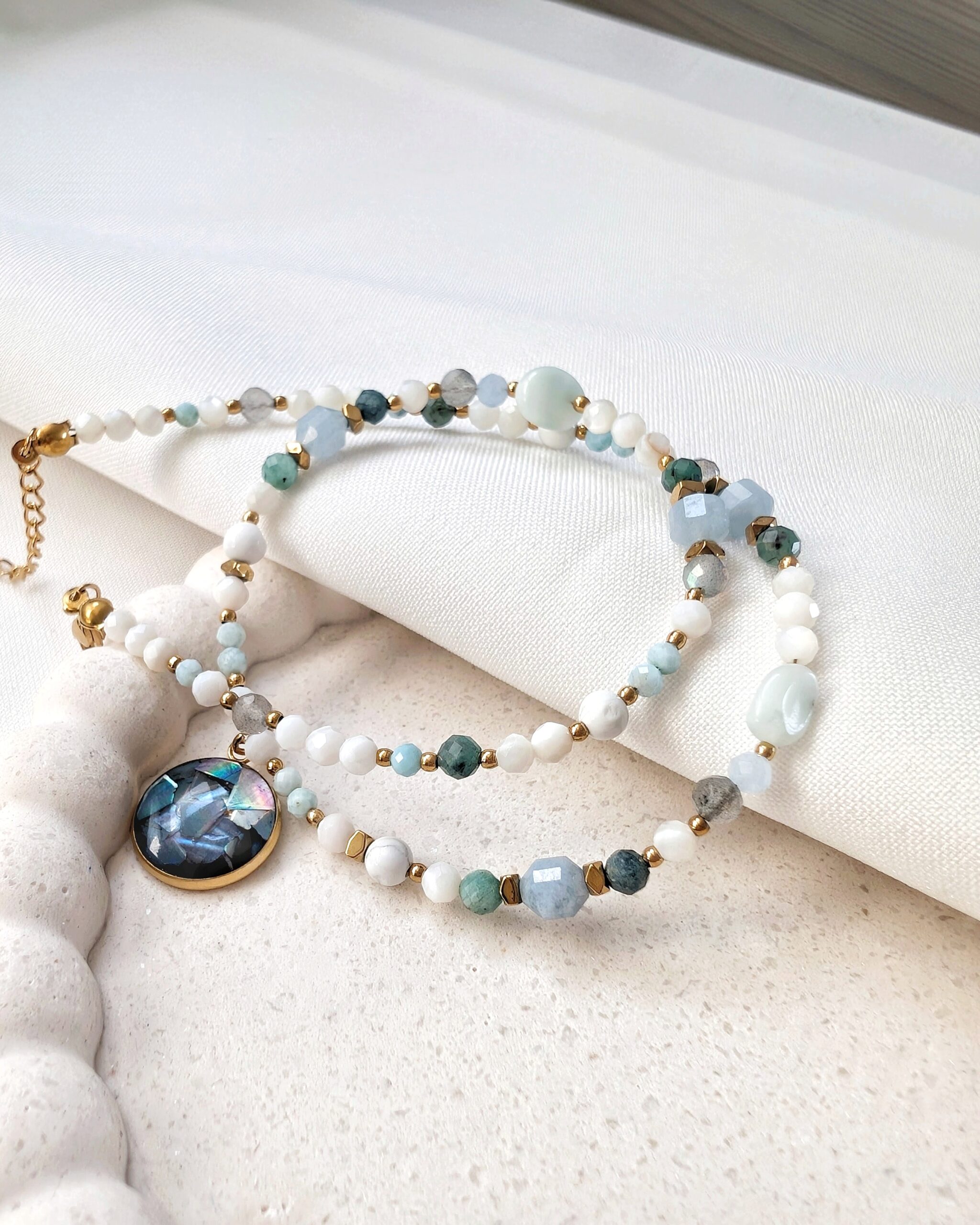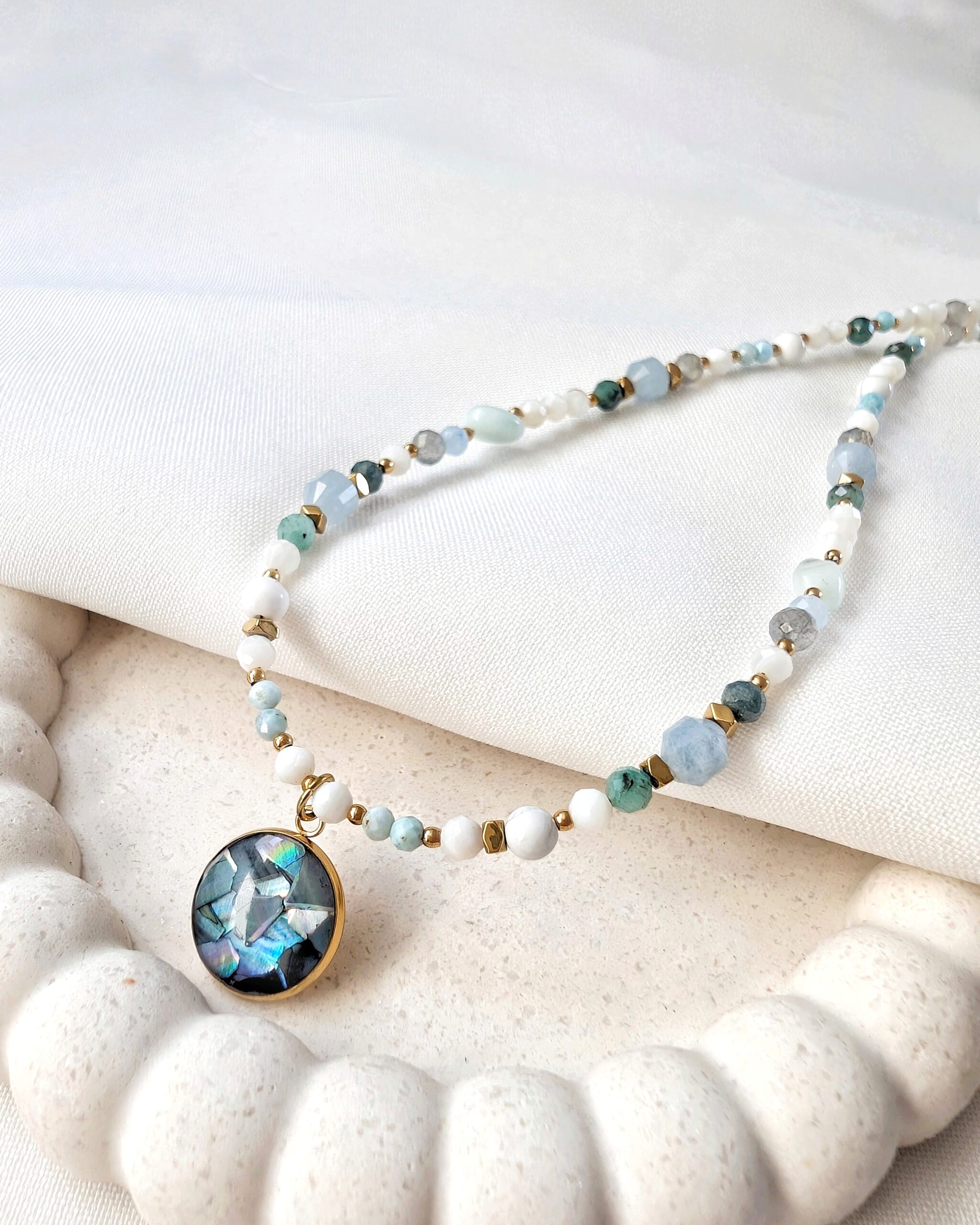 Akwamaryn, szmaragd, turmalin niebieski, larimar, angelit, labradoryt, howlit oraz muszla.