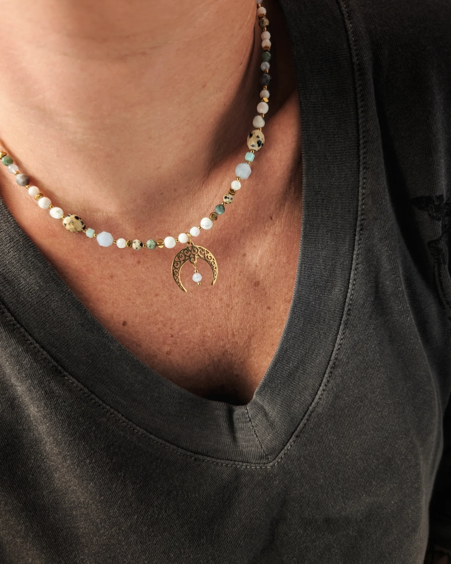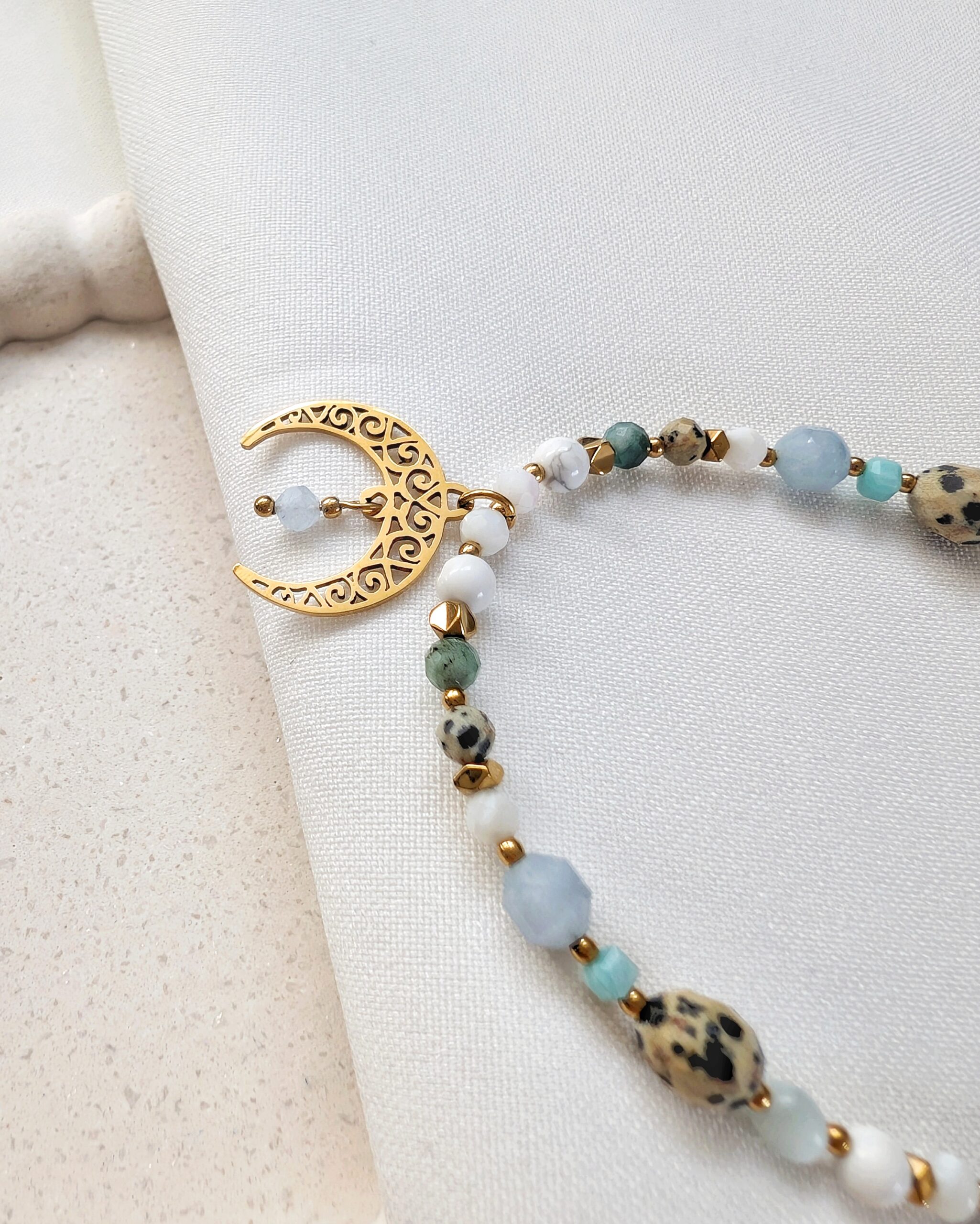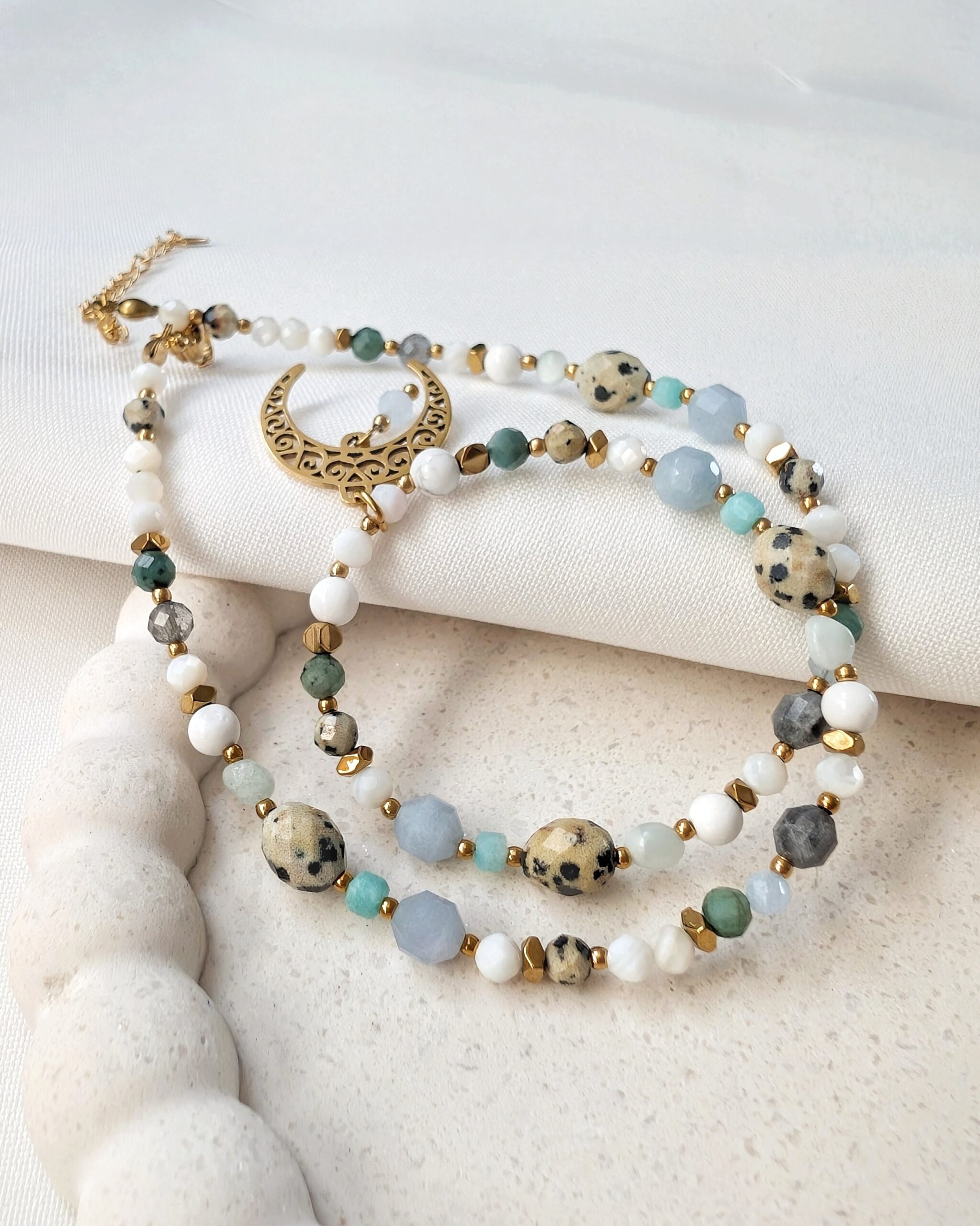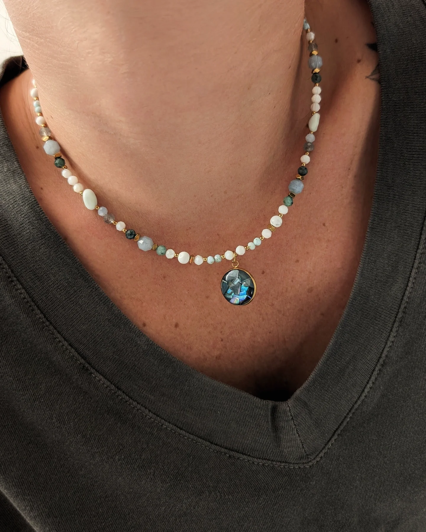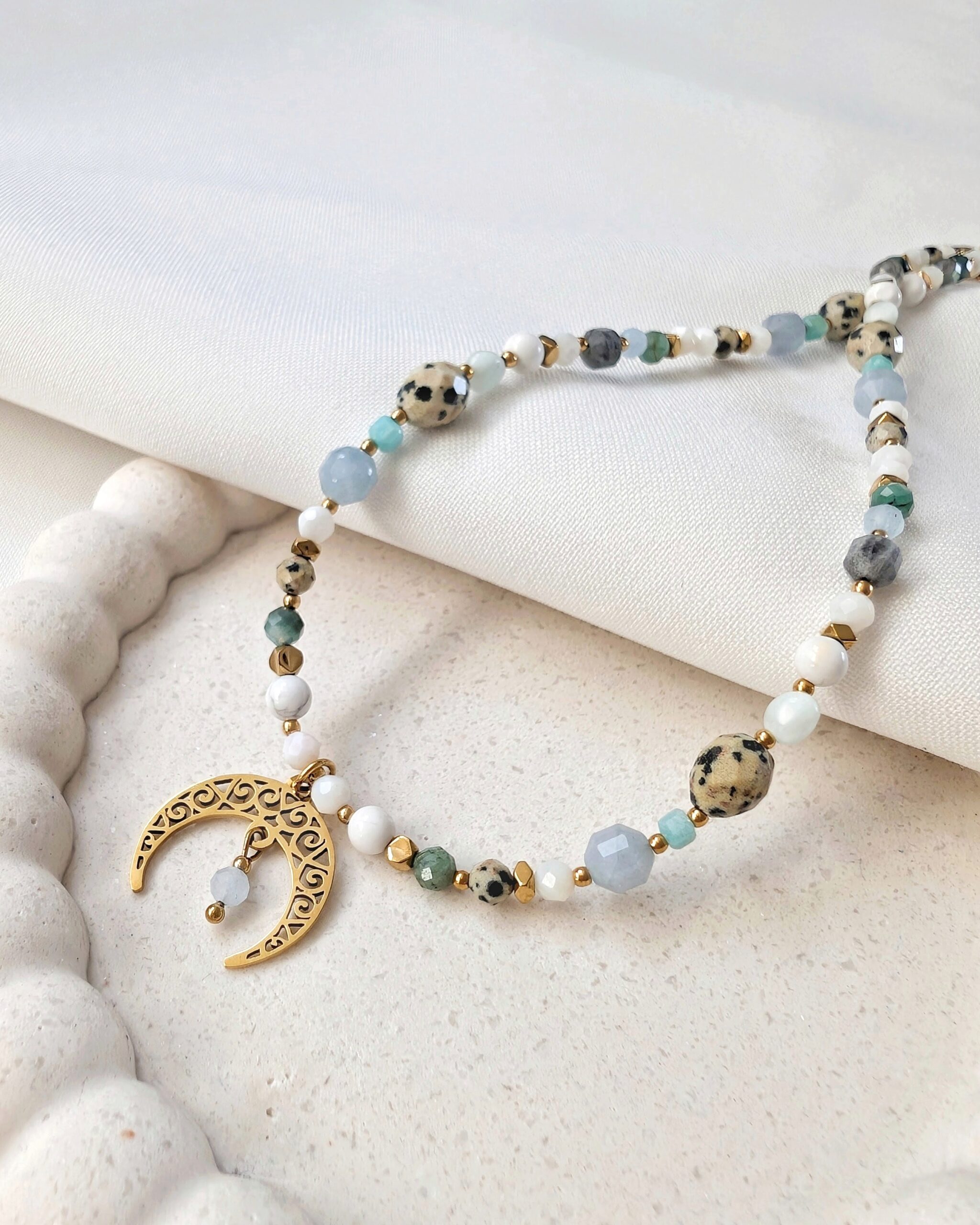 Akwamaryn, szmaragd, turmalin niebieski, larimar, angelit, labradoryt, howlit oraz muszla.